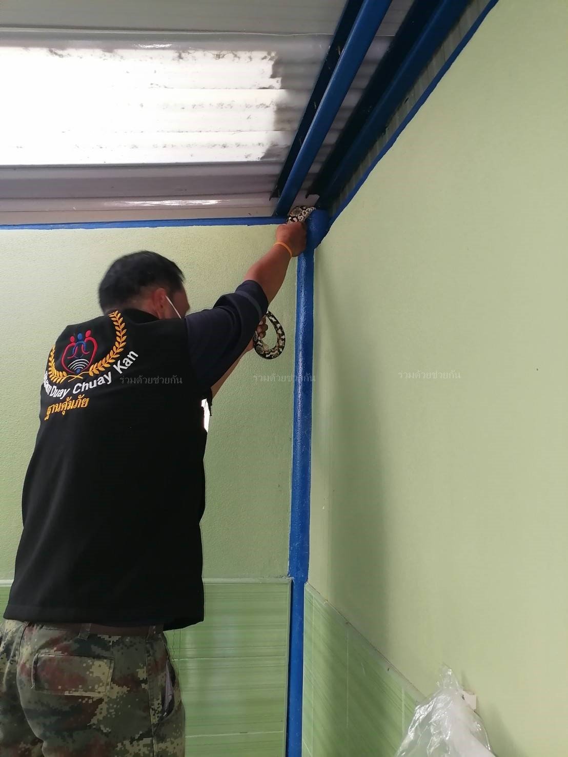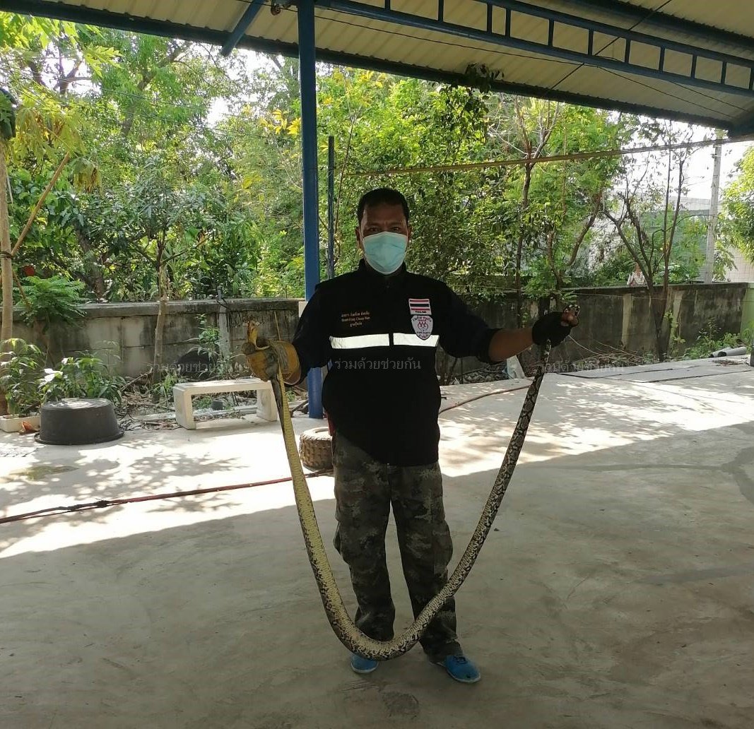 อาสาร่วมด้วยฐานคุ้มภัย เข้าช่วยเหลือจับงู รับแจ้งจากประชาชน มีงูเลื้อยเข้าบ้าน ซอยรามอินทรา 40 แขวงนวลจันทร์ เขตบึงกุ่ม กรุงเทพฯ