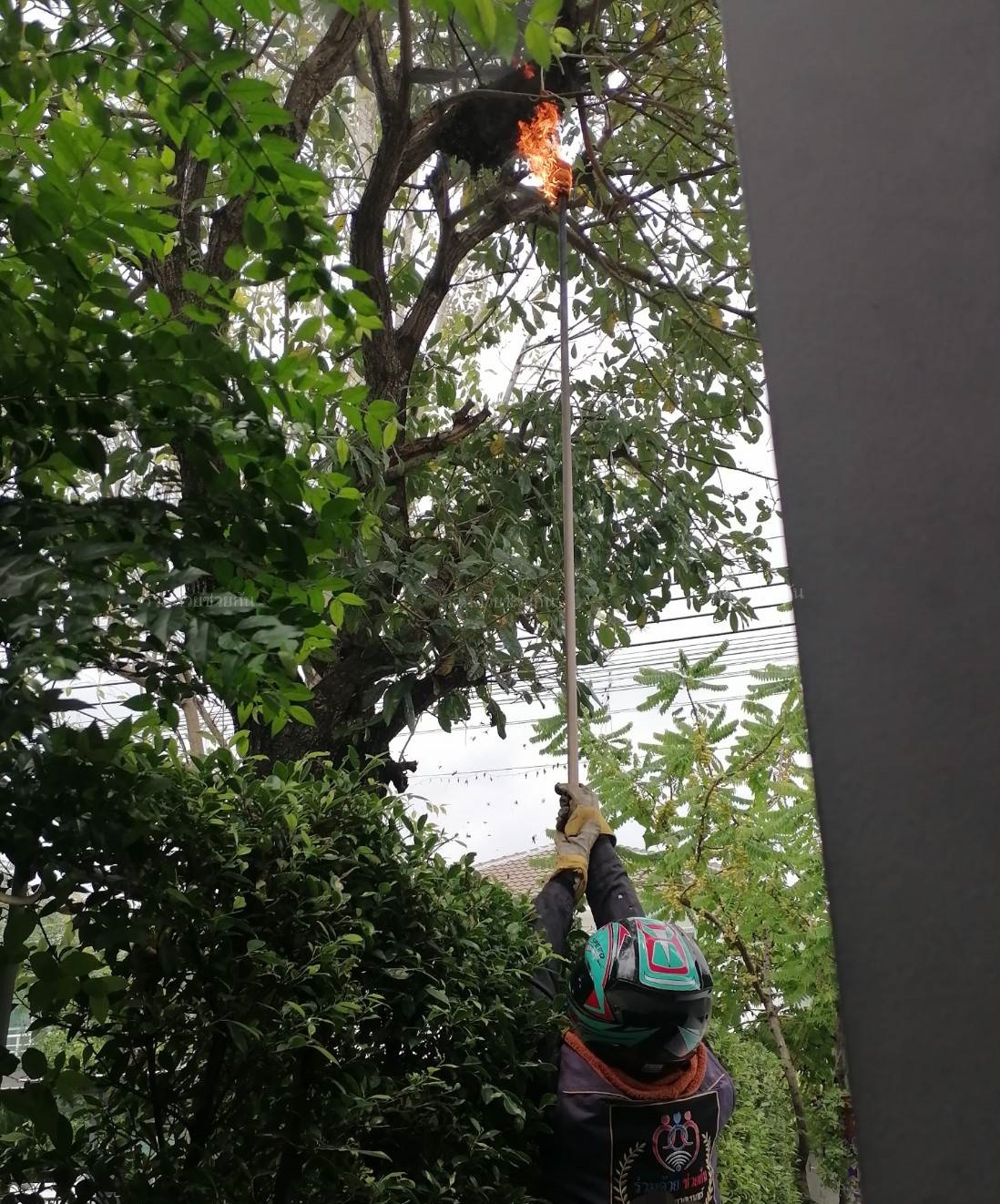 อาสาฯ เข้าไปช่วยเหลือ ตรวจสอบรังผึ้งขนาดใหญ่บนต้นไม้ จึงนำอุปกรณ์จุดไฟรมควันไล่ผึ้งออกจากรัง เคลื่อนย้ายออกจากพื้นที่ให้เป็นที่เรียบร้อย