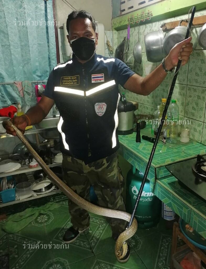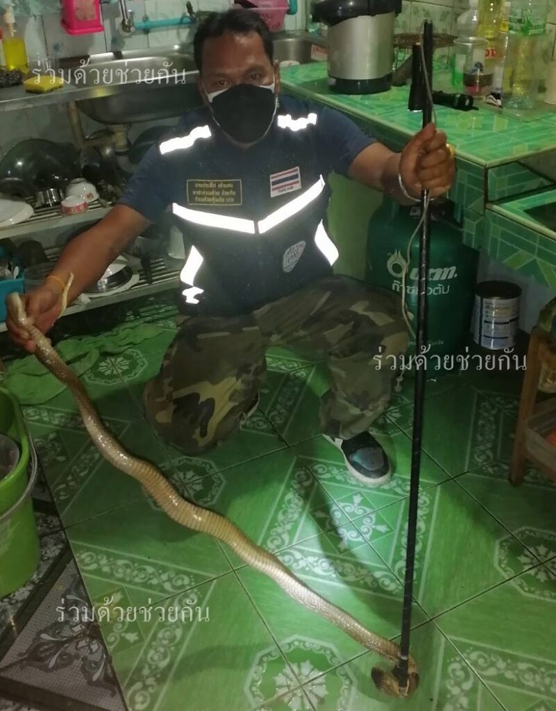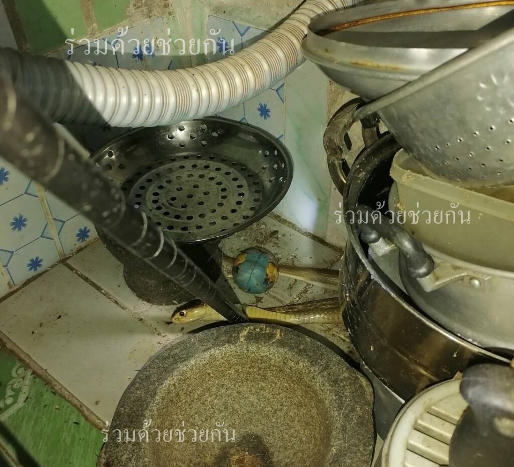 คุณฐายิกา แจ้งผ่านสายด่วน 1677 ขอความช่วยเหลือให้ช่วยจับงูเห่า ภายในบริเวณบ้าน ถ.รามอินทรา ซอย 109 แขวงมีนบุรี เขตมีนบุรี กรุงเทพฯ ศูนย์สื่อสารร่วมด้วยช่วยกัน ประสานอาสาร่วมด้วยคุ้มภัย 153,154 เข้าช่วยเหลือ พบเป็นงูเห่าความยาวประมาณ 1 เมตร หลบซ่อนตัวอยู่ในห้องครัว