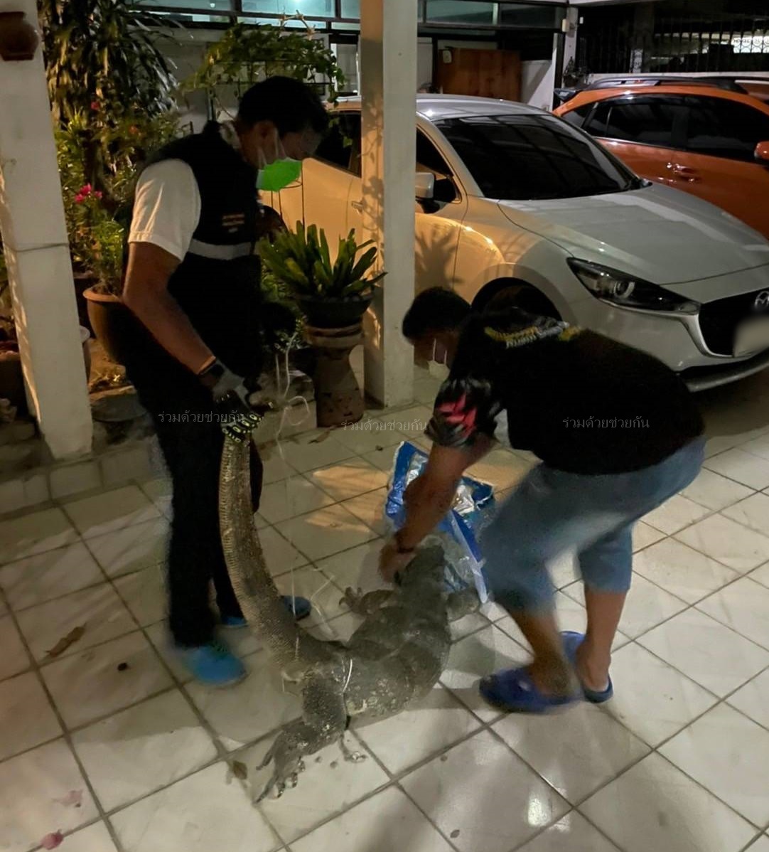ตรวจสอบพบตัวเงินตัวทองขนาดใหญ่ เข้าไปซุกอยู่ใต้รถยนต์ที่จอดอยู่ อาสาฯ จึงนำอุปกรณ์จับออกมาได้สำเร็จ ก่อนจับใส่กระสอบนำไปปล่อยคืนสู่ธรรมชาติต่อไป