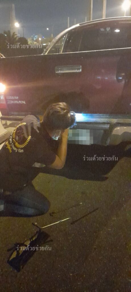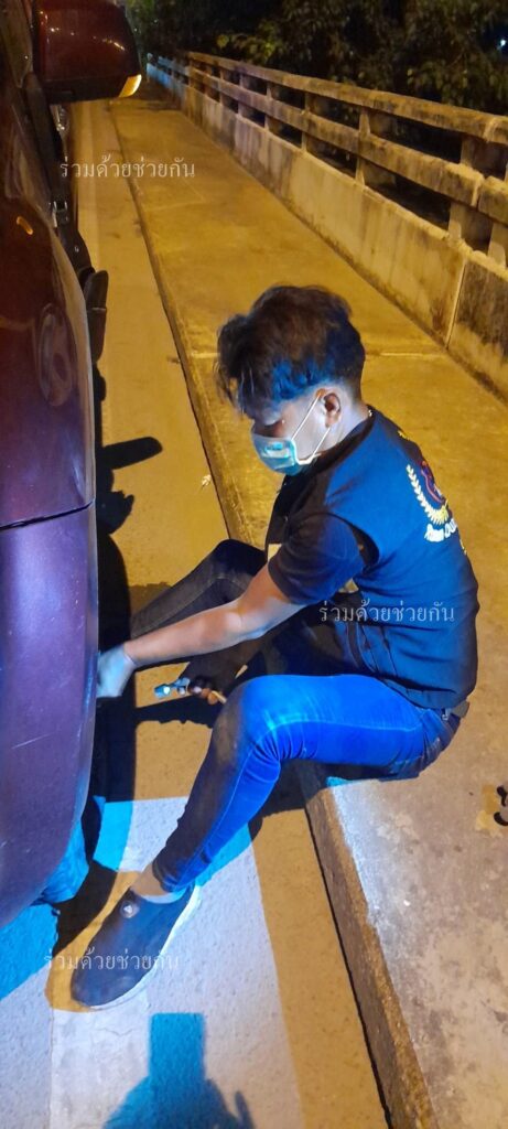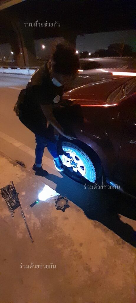 อาสาร่วมด้วยได้นำอุปกรณ์เข้าช่วยเหลือ ทำการปรับเปลี่ยนล้อยางอะไหล่ให้เป็นผลสำเร็จ รถขับเคลื่อนต่อไปได้ พื้นที่สน.โคกคราม