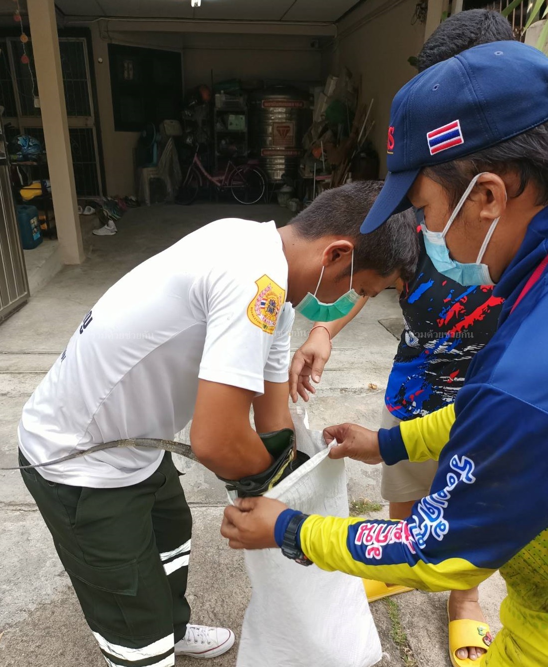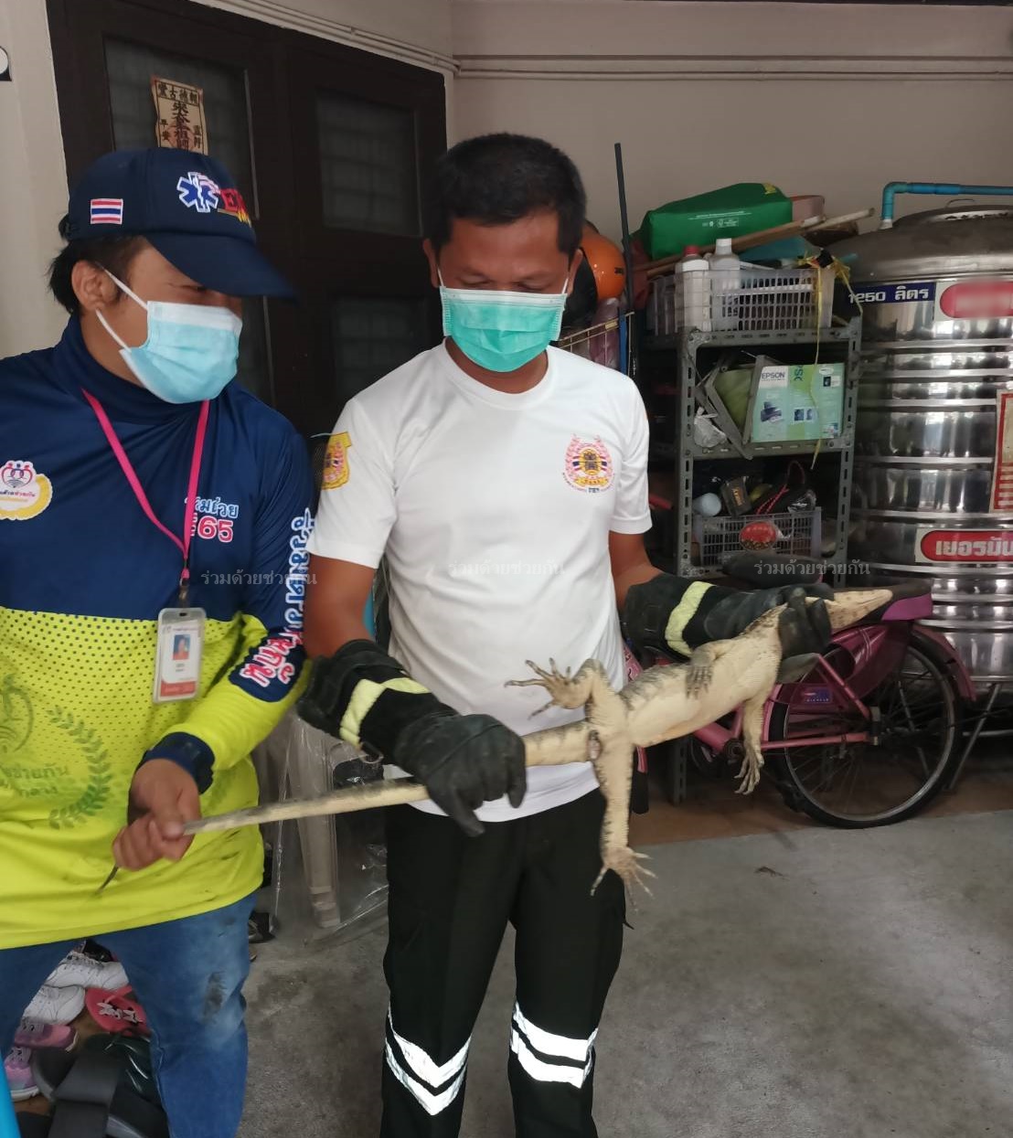 ตรวจสอบพบตัวเงินตัวทองหลบซ่อนตัวอยู่บริเวณซอกกำแพง ข้างแท็งก์น้ำ อาสาฯ จึงนำอุปกรณ์คล้องจับไว้ได้ ก่อนจับใส่กระสอบ นำไปปล่อยคืนสู่ธรรมชาติต่อไป