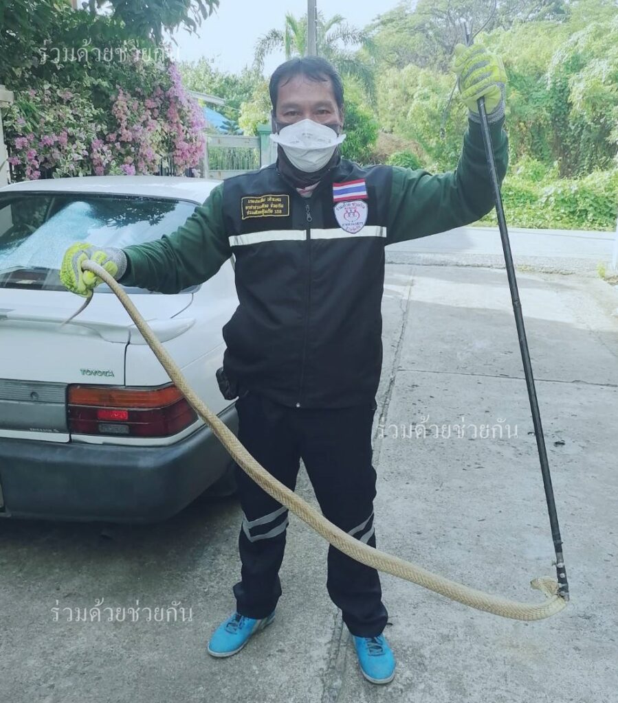 อาสาร่วมด้วยได้นำอุปกรณ์เข้าช่วยเหลือ ทำการคล้องจับตัวงูเอาไว้ได้เป็นผลสำเร็จ และนำไปปล่อยคืนสู่ธรรมชาติห่างไกลบ้านเรือนประชาชนต่อไป พื้นที่สน.คันนายาว