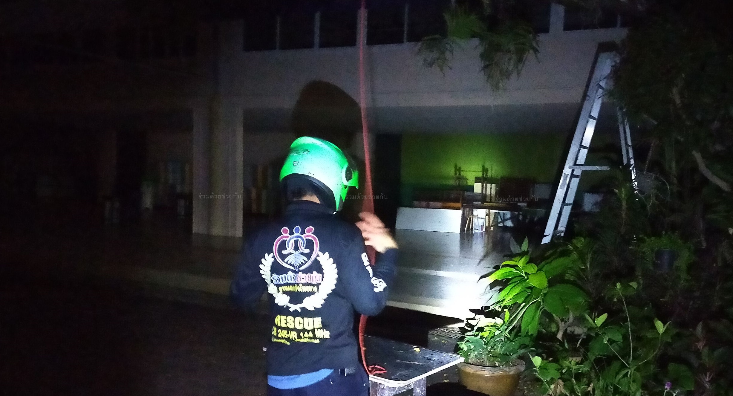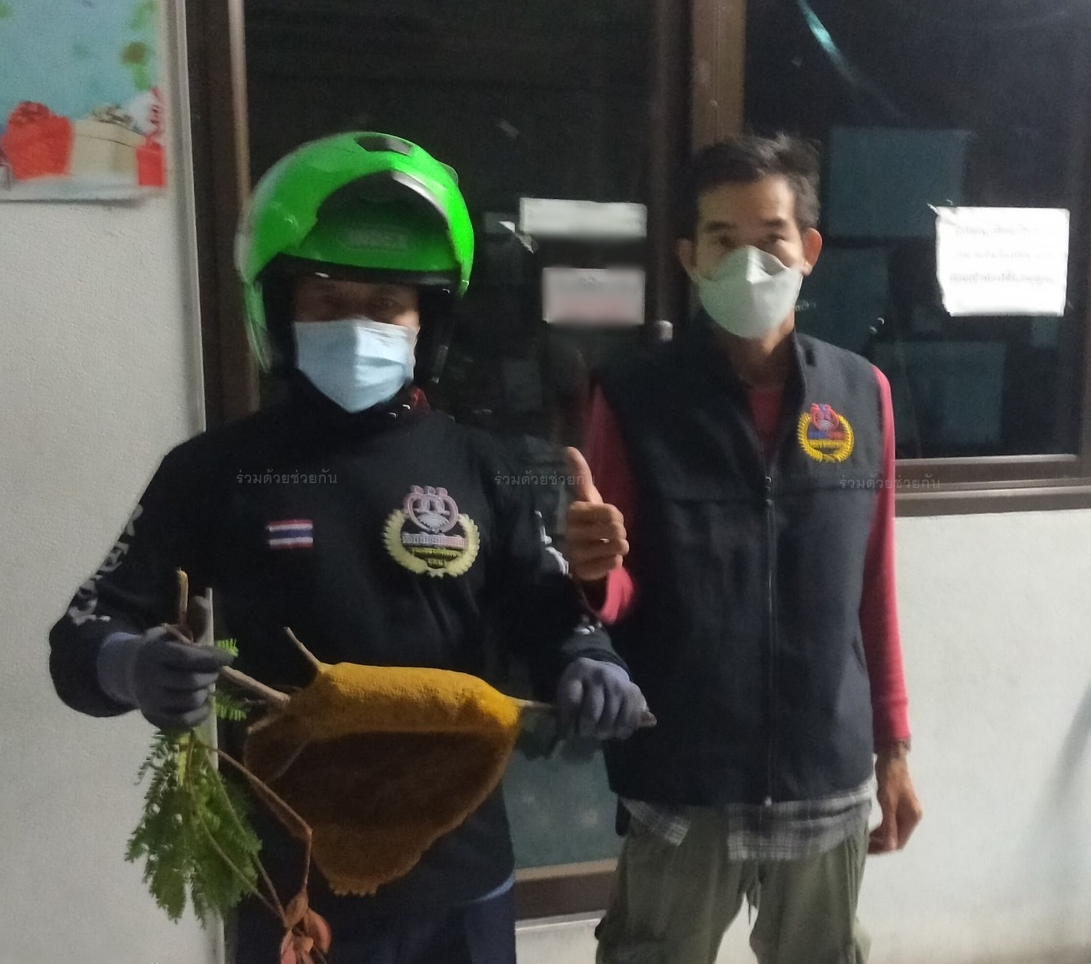 อาสาฯ เข้าไปตรวจสอบพร้อมชุดอุปกรณ์กำจัด พบผึ้งทำรังบนต้นไม้ จึงจุดไฟรมควันกำจัดรังผึ้ง พร้อมเคลื่อยย้ายรังออกจากพื้นที่เป็นที่เรียบร้อย