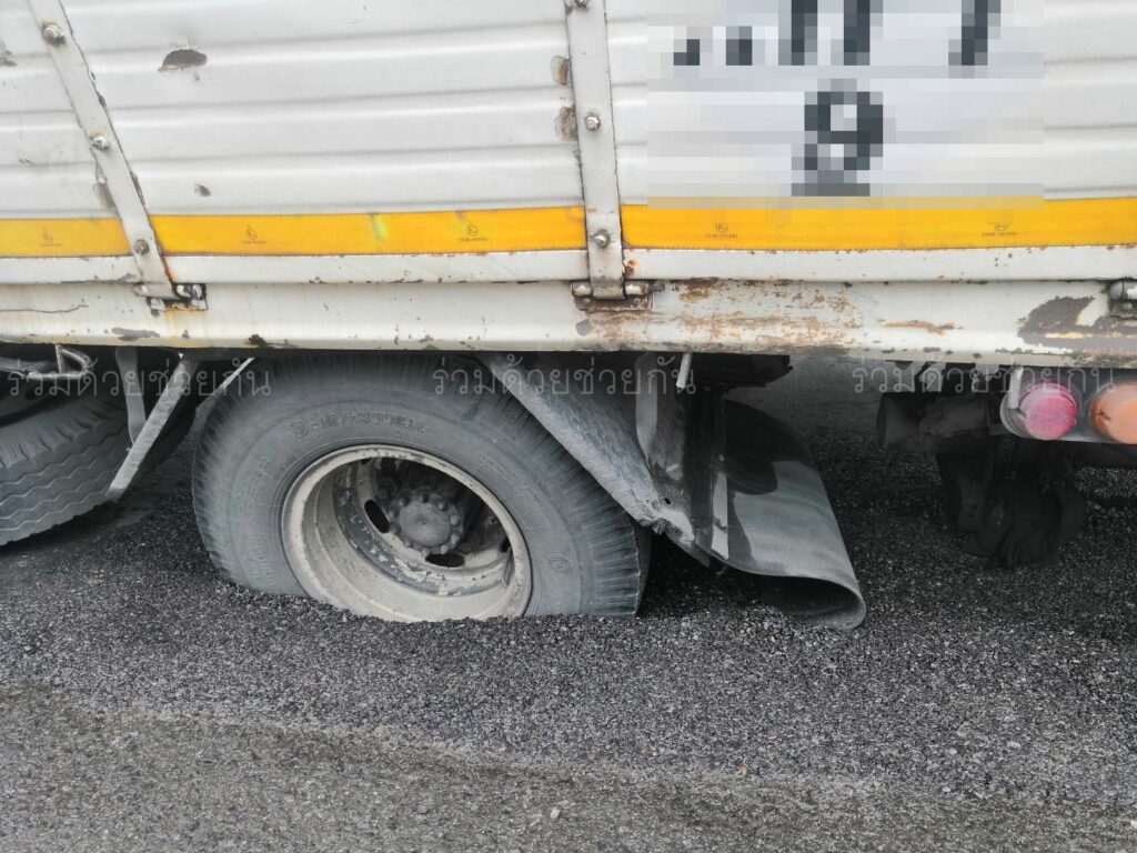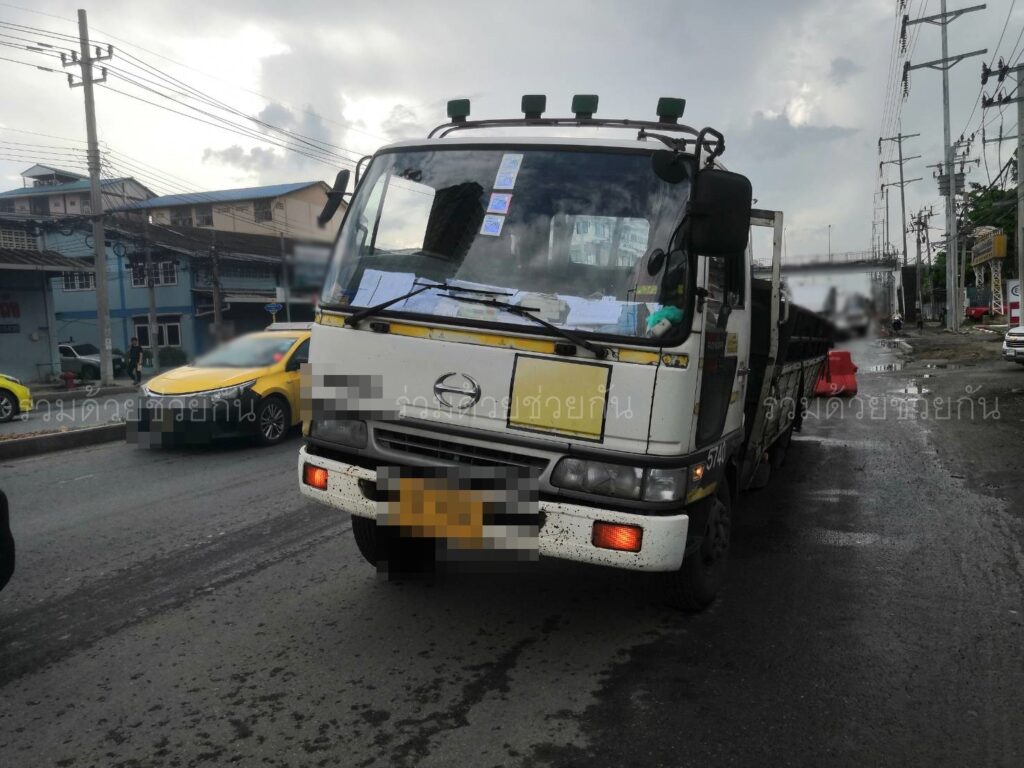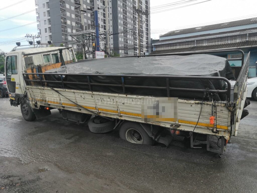 อาสาฯ เตือนถนนทรุดตัว มีรถบรรทุกตกหลุม หน้าปั๊มน้ำมันเอสโซ่ ถ.แพรกษา จ.สมุทรปราการ