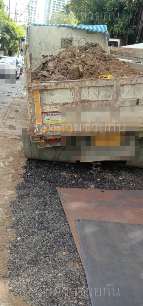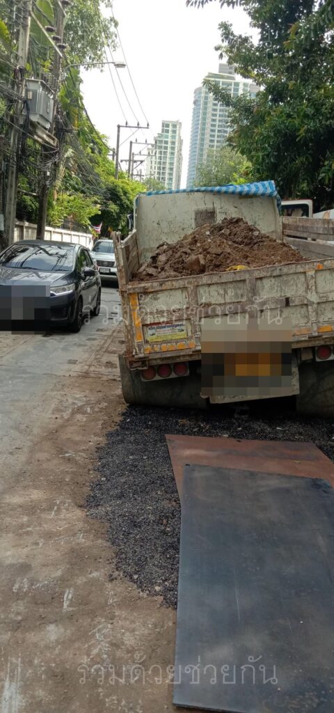 อาสาฯแจ้งเตือน รถบรรทุกดินติดหล่ม จากเหตุถนนชำรุด ปากซอยประชัญคดี ถนนสุขุมวิท 39