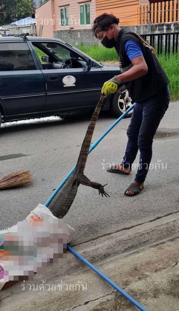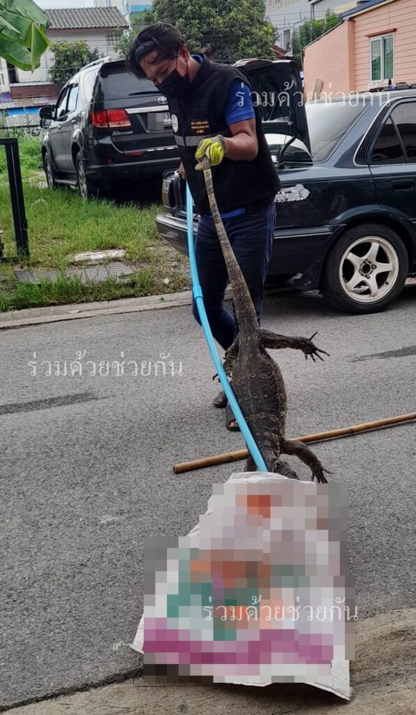 อาสาร่วมด้วยคุ้มภัย 026 รับแจ้งจากประชาชนขอความช่วยเหลือจับสัตว์เลื้อยคลาน ภายในบ้านพัก ถ.สุเหร่าคลองหนึ่ง ซอย 11 แยก 2 แขวงบางชัน เขตคลองสามวา กรุงเทพมหานคร พบเป็นตัวเงินตัวทองจำนวน 1 ตัว ความยาวประมาณ 2 เมตร หลบซ่อนตัวอยู่ภายในที่พักอาศัย