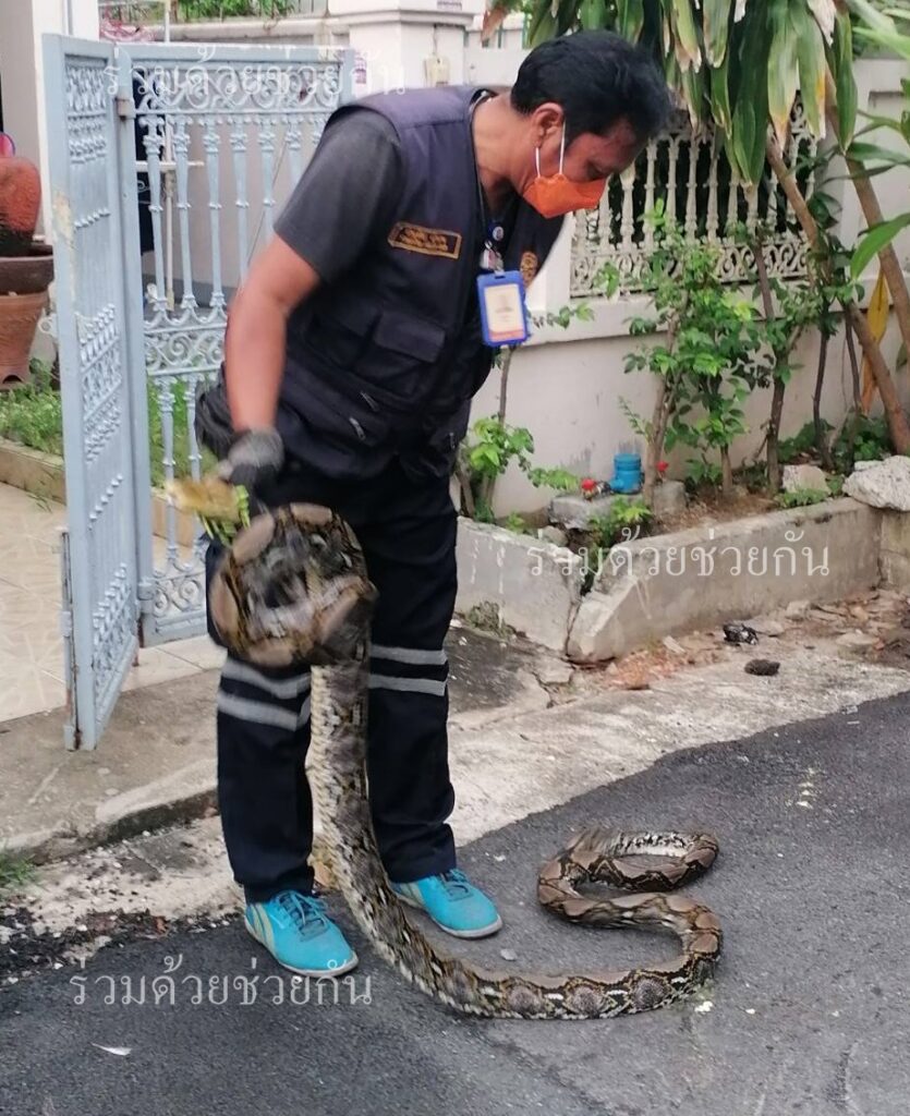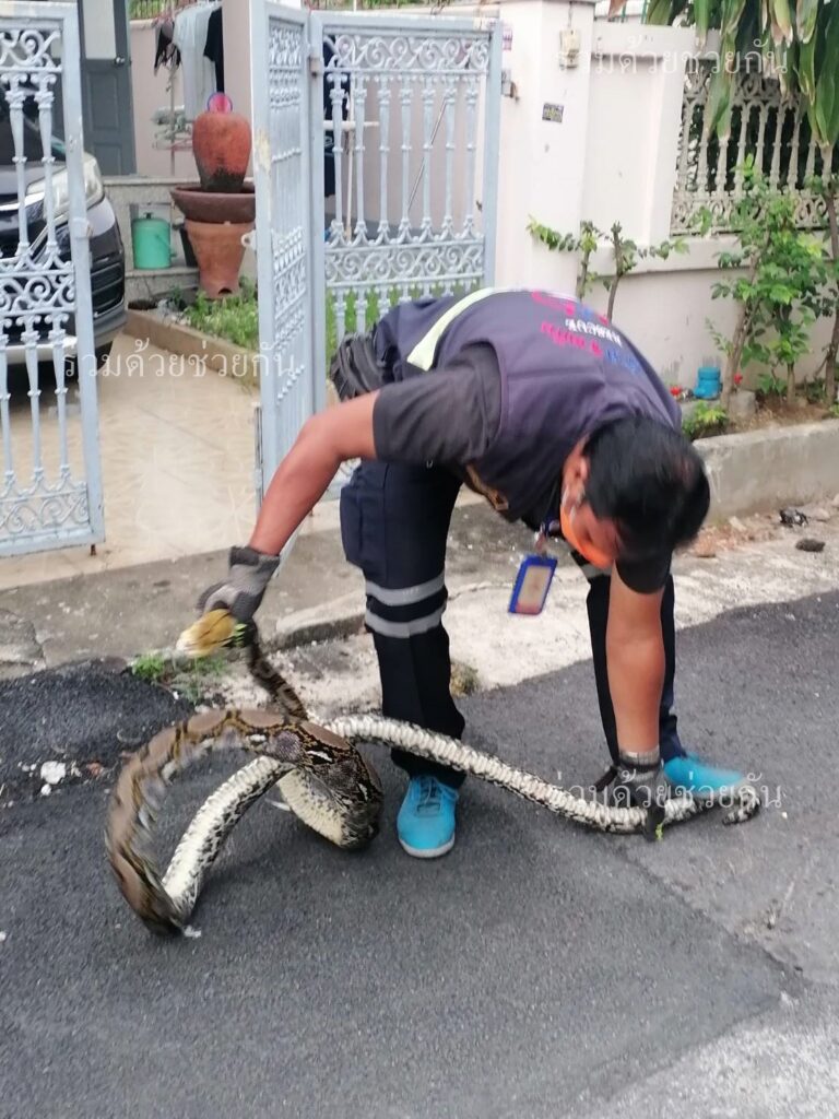 อาสาร่วมด้วยคุ้มภัย 006 รับแจ้งจากประชาชนขอความช่วยเหลือให้ช่วยจับสัตว์เลื้อยคลาน บริเวณบ้านพัก หมู่บ้านเค.ซี.รามอินทรา 5 ถ.พระยาสุเรนทร์ ซอย 40 แขวงสามวาตะวันตก เขตคลองสามวา กรุงเทพฯ พบเป็นงูเหลือมจำนวน 1 ตัว ความยาวประมาณ 3 เมตร หลบซ่อนตัวอยู่พุ่มไม้บนกำแพงรั้วบ้าน
