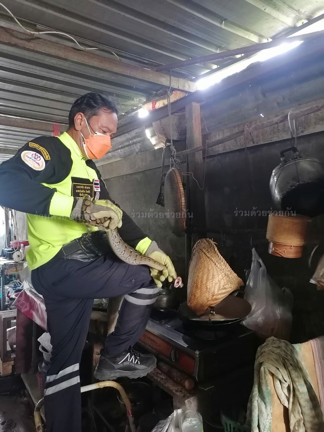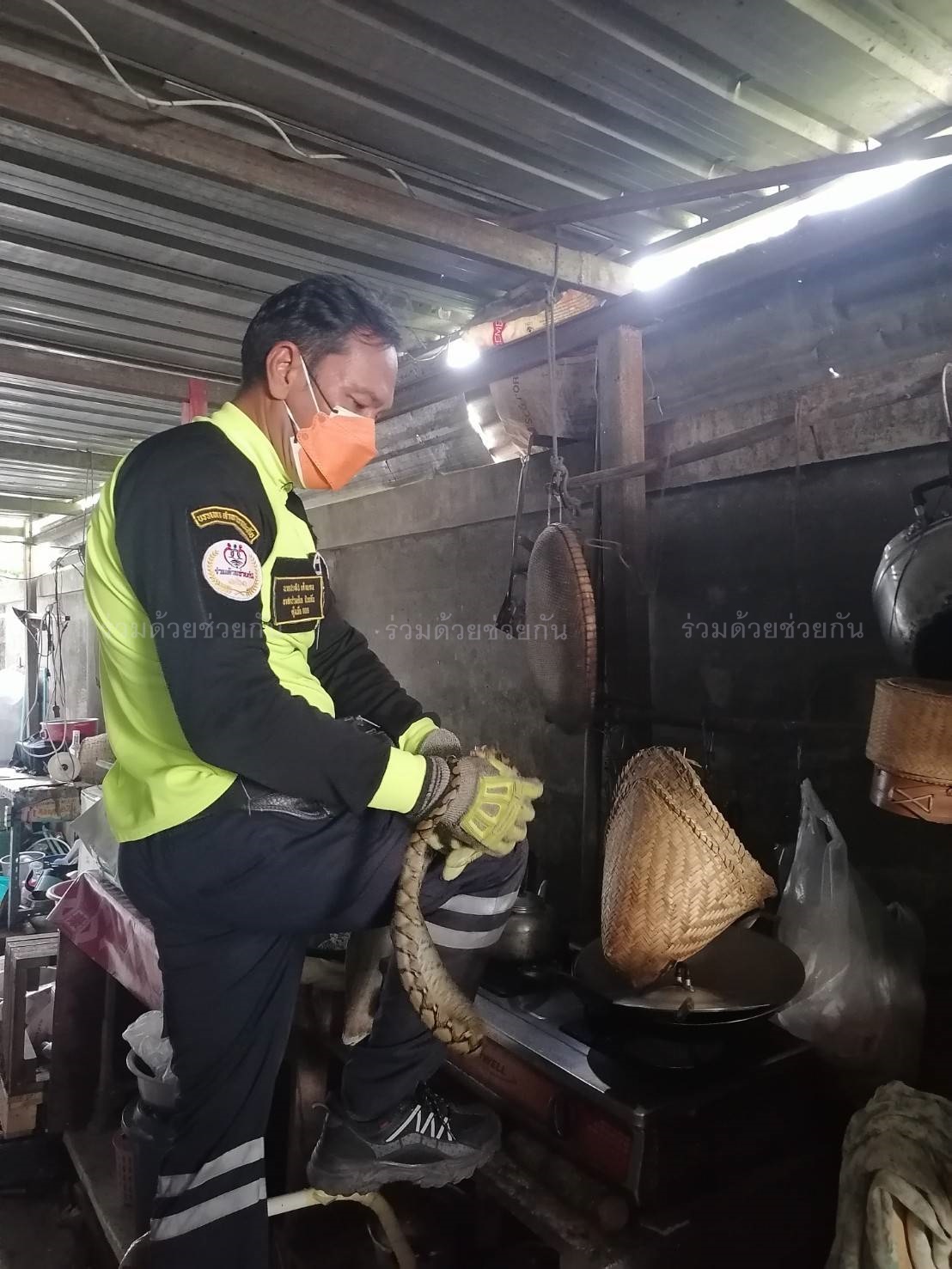ตรวจสอบพบงูเหลือม ขดตัวอยู่ใต้หลังคาห้องครัว อาสาฯ จึงนำอุปกรณ์จับลงมาด้านล่างได้สำเร็จ ก่อนนำไปปล่อยคืนสู่ธรรมชาติต่อ