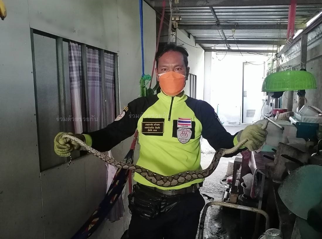 งูเหลือมบุกบ้าน ซุกใต้หลังคา แจ้งอาสาช่วยจับปล่อยป่า
