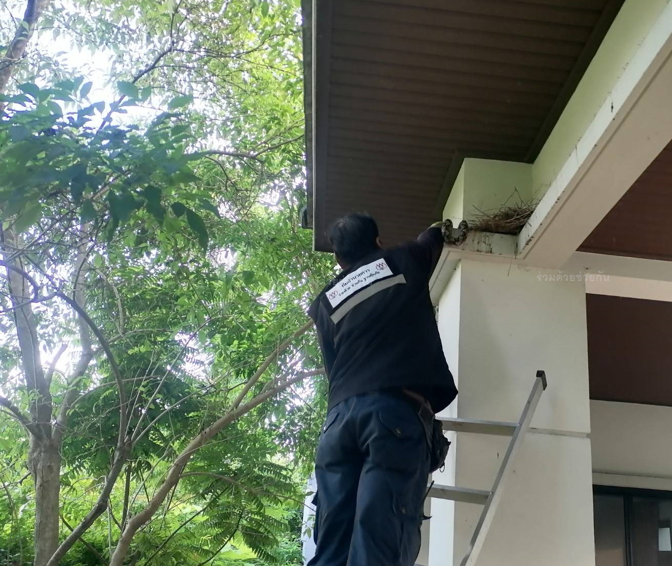 ตรวจสอบพบงูเหลือมขดตัวอยู่ใต้หลังคาบ้าน อาสาฯ จึงใช้บันไดปีนขึ้นไปจับตัว พบว่างูกินนกเข้าไป ก่อนจับใส่กระสอบนำไปปล่อยคืนสู่ธรรมชาติต่อไป