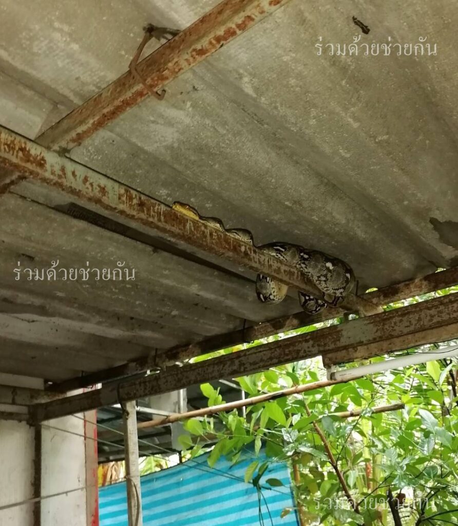 อาสาร่วมด้วยคุ้มภัย 006 รับแจ้งจากประชาชนขอความช่วยเหลือจับสัตว์เลื้อยคลาน ภายในบริษัท ถ.พระยาสุเรนทร์ ซอย 20 แขวงบางชัน เขตคลองสามวา กรุงเทพฯ พบเป็นงูเหลือมจำนวน 1 ตัว หลบซ่อนตัวอยู่บนขื่อเหล็กใต้หลังคา