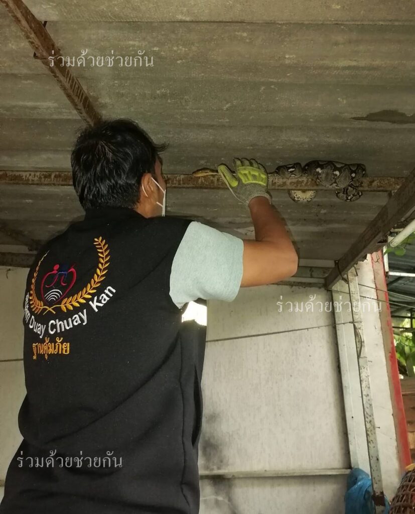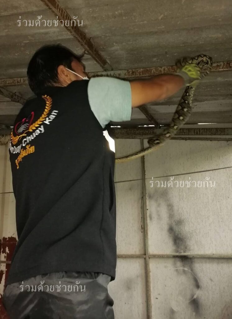 อาสาร่วมด้วยได้นำอุปกรณ์เข้าช่วยเหลือ ทำการปีนบันไดขึ้นไปจับดึงตัวงูลงมาได้เป็นผลสำเร็จ ความยาว 2 เมตรครึ่ง และนำไปปล่อยคืนสู่ธรรมชาติเป็นที่เรียบร้อย พื้นที่สน.บางชัน