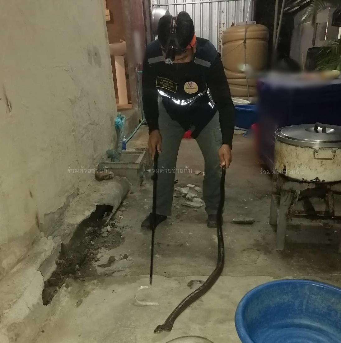 ตรวจสอบพบงูเห่า ซุกตัวอยู่ในโพรงข้างกำแพงร้าน อาสาฯจึงนำอุปกรณ์คล้องจับไว้ได้ ก่อนจับใส่ถังพลาสติก นำไปปล่อยคืนสู่ธรรมชาติต่อไป