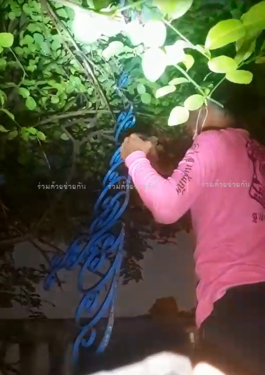 ตรวจสอบพบผึ้งทำรังบนต้นไม้ ข้างกำแพงรั้วบ้าน อาสาฯ จึงใช้บันไดปีนขึ้นไป นำอุปกรณ์จุดไฟเผาไล่รมควันกำจัดผึ้งออกจากรังได้สำเร็จ และเคลื่อนย้ายออกจากพื้นที่เรียบร้อย