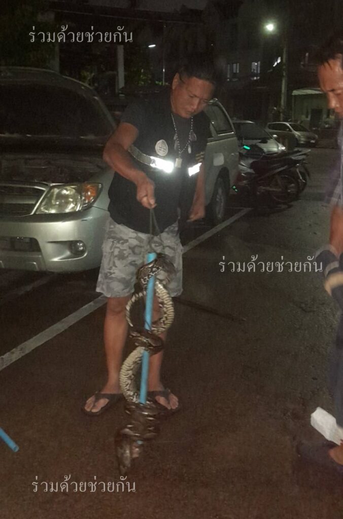 อาสาร่วมด้วยได้นำอุปกรณ์เข้าช่วยเหลือ ทำการคล้องจับดึงตัวงูออกมาได้เป็นผลสำเร็จ ความยาวประมาณ 2 เมตร พร้อมได้นำใส่กระสอบและนำไปปล่อยคืนสู่ธรรมชาติเป็นที่เรียบร้อย พื้นที่สน.โคกคราม