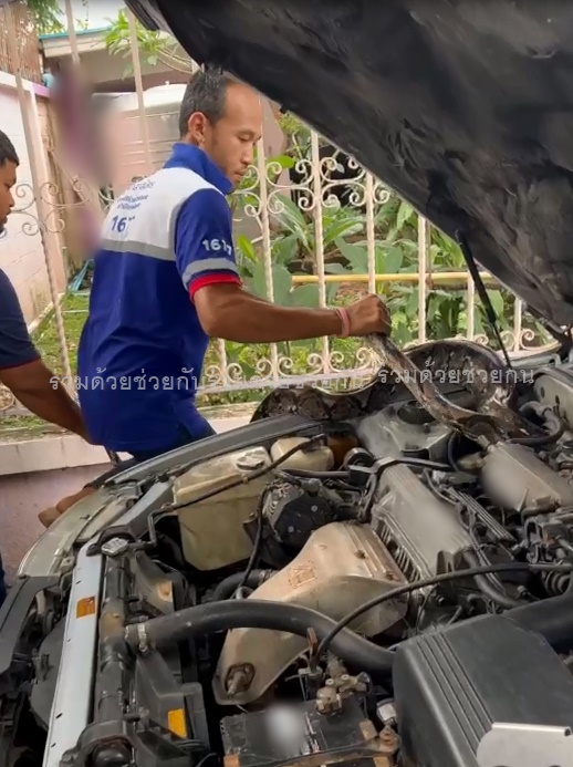 เจ้าของตกใจ งูเหลือมเลื้อยเข้ารถ แจ้งอาสาช่วยจับปล่อยธรรมชาติ