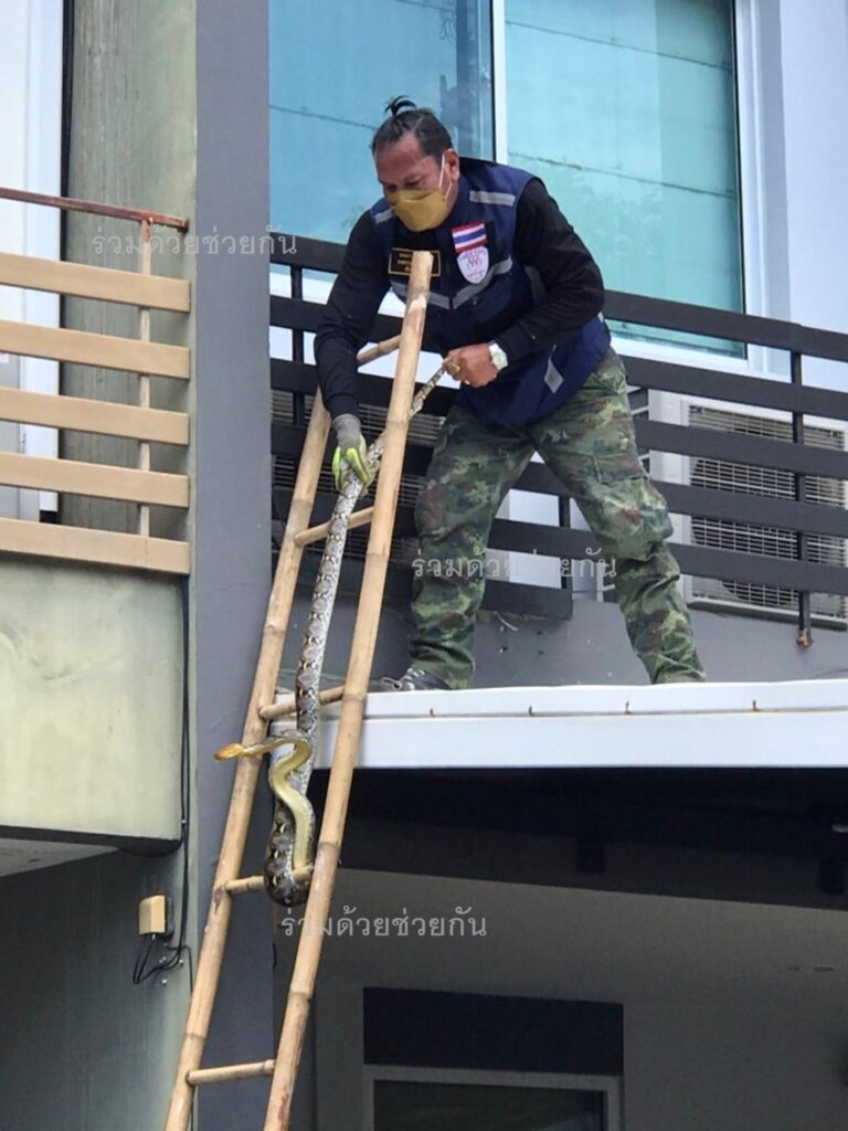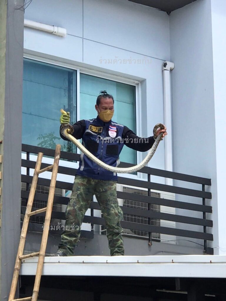 อาสาใช้อุปกรณ์ไม้คล้องเข้าช่วยเหลือสามารถจับงูไว้ได้ มีความยาวประมาณ 3 เมตร พร้อมนำปล่อยคืนสู่ธรรมชาติห่างไกลบ้านเรือนประชาชนแล้ว