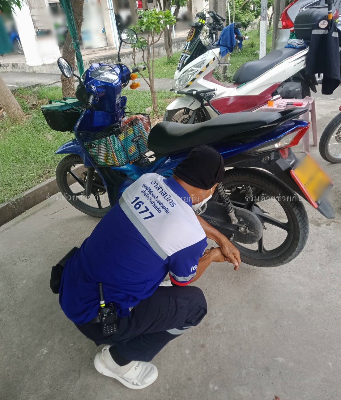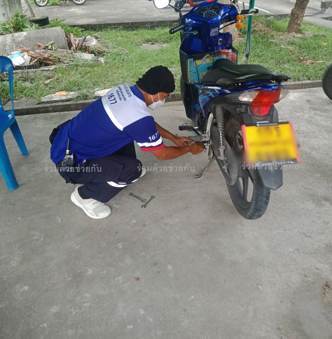 ตรวจสอบพบรถจักรยานยนต์ ฮอนด้าเวฟ สีน้ำเงิน โซ่หลุด อาสาฯ นำอุปกรณ์เข้าช่วยเหลือปรับตั้งโซ่ได้เป็นผลสำเร็จ สามารถเดินทางต่อได้