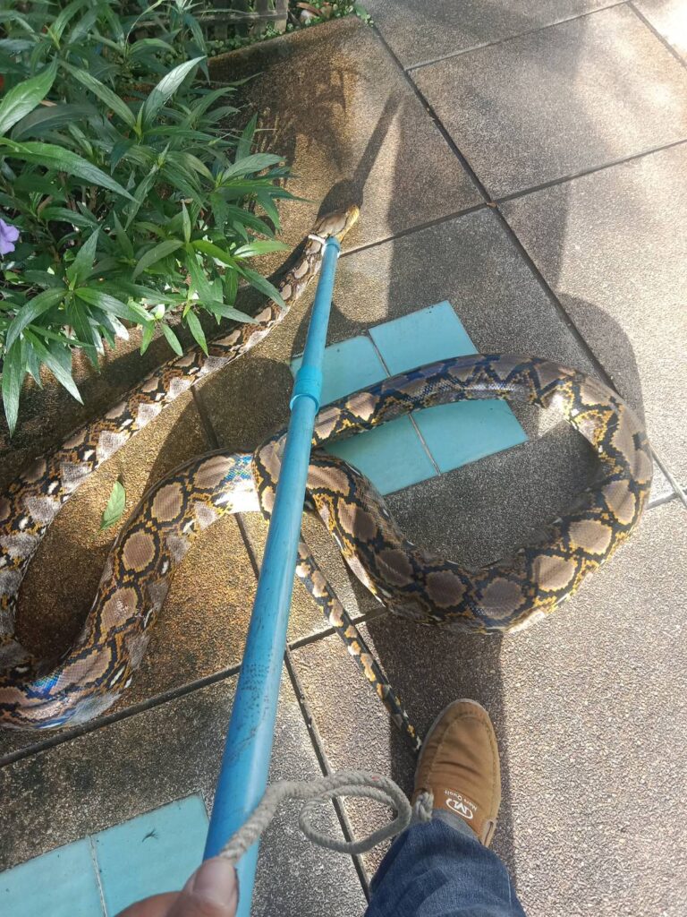 อาสานำอุปกรณ์ไม้คล้องเข้าช่วยเหลือสามารถจับงูไว้ได้ มีความยาวประมาณ 4 เมตร พร้อมนำปล่อยคืนสู่ธรรมชาติห่างไกลบ้านเรือนประชาชนต่อไป