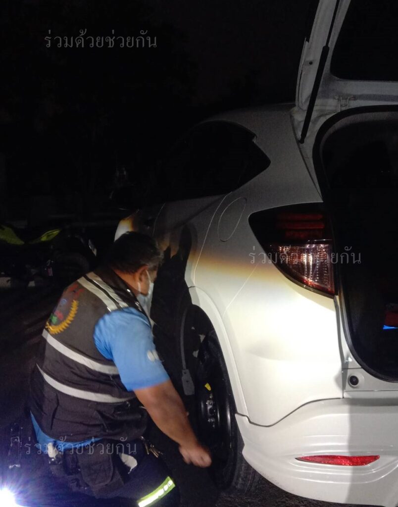 อาสาร่วมด้วยได้เข้าตรวจสอบพบรถยางรั่วล้อหลังข้างซ้าย จึงได้นำอุปกรณ์เข้าช่วยเหลือ ทำการปรับเปลี่ยนล้อยางอะไหล่ให้เป็นผลสำเร็จ รถขับเคลื่อนต่อไปได้ ทำให้ประชาชนขับรถกลับบ้านได้อย่างปลอดภัย พื้นที่สน.บางขุนเทียน