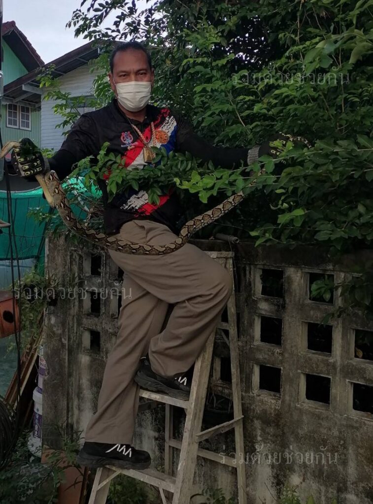 อาสาร่วมด้วยคุ้มภัย 006 รับเเจ้งจากประชาชนขอความช่วยเหลือจับสัตว์เลื้อยคลาน บริเวณบ้านพัก ถ.หทัยราษฎร์ ซอย 3 เเยก 3 แขวงมีนบุรี เขตมีนบุรี กรุงเทพฯ ตรวจสอบพบเป็นงูเหลือมความยาวประมาณ 2 เมตร ขดตัวอยู่บนต้นไม้ข้างกำแพงรั้วบ้าน