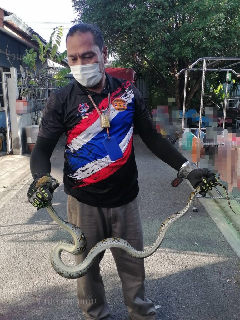 อาสาร่วมด้วยได้นำอุปกรณ์เข้าช่วยเหลือ ทำการปีนบันไดขึ้นไปจับตัวงูดึงลงมาจากต้นไม้ได้เป็นผลสำเร็จ และนำไปปล่อยคืนสู่ธรรมชาติเป็นที่เรียบร้อย พื้นที่สน.มีนบุรี