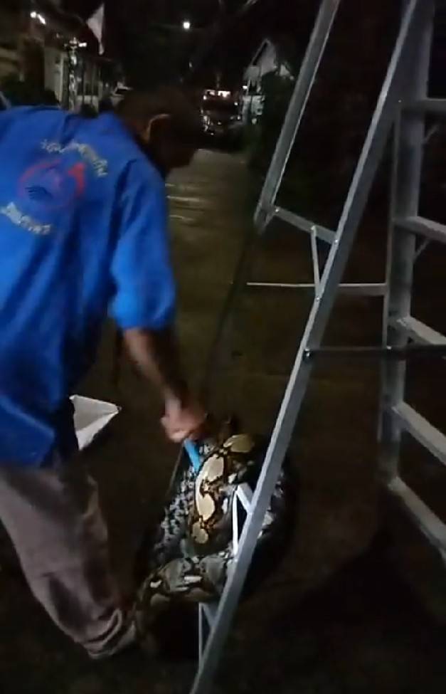 ตรวจสอบพบงูเหลือมขนาดใหญ่เลื้อยขดตัวพันอยู่บนต้นไม้ อาสาฯ จึงนำอุปกรณ์จับลงมาด้านล่าง งูเหลือมความยาวกว่า 4 เมตร ก่อนจับใส่กระสอบนำปล่อยคืนสู่ธรรมชาติต่อไป