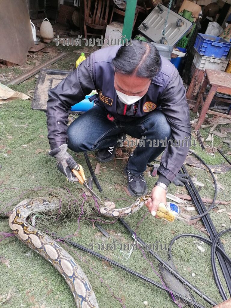 อาสาใช้กรรไกรตัดตาข่ายสามารถนำงูออกจากตาข่ายได้สำเร็จ พร้อมนำปล่อยคืนสู่ธรรมชาติห่างไกลบ้านเรือนประชาชน