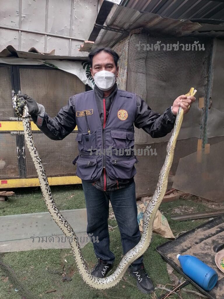ศูนย์สื่อสารร่วมด้วยช่วยกัน รับแจ้งจาก อาสาร่วมด้วยคุ้มภัย 006 ให้การช่วยเหลือประชาชน ขอความช่วยเหลืองูเข้าบ้าน ภายในซอยคู้บอน 27 แยก 38 แขวงท่าแร้ง เขตบางเขน กรุงเทพฯ ตรวจสอบพบงูเหลือมความยาวประมาณ 4 เมตร ติดตาข่ายอยู้บริเวณบ้านพัก