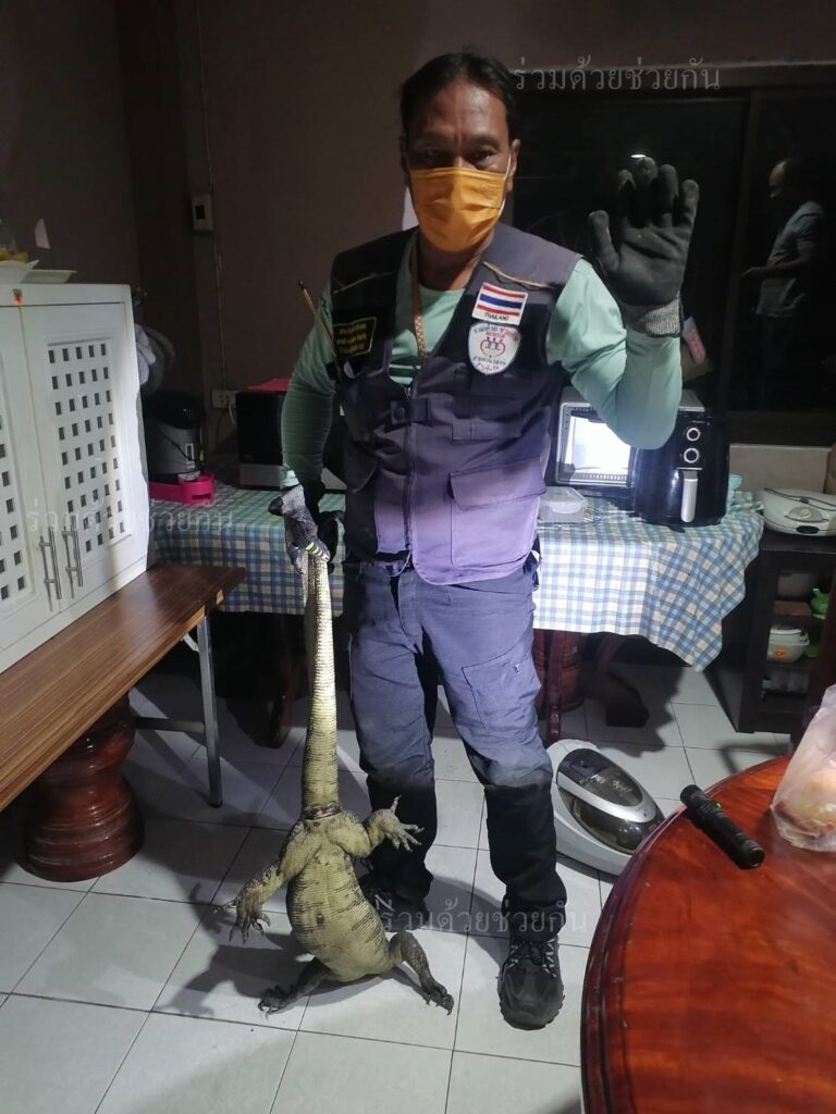อาสาร่วมด้วยช่วยกัน รับเเจ้งจากประชาชนขอความช่วยเหลือให้ช่วยจับสัตว์เลื้อยคลาน ภายในบ้านพัก ถ.เสรีไทย ซอย 64/1 แขวงคลองกุ่ม เขตบึงกุ่ม กรุงเทพฯ พบเป็นตัวเงินตัวทอง จำนวน 1 ตัว ความยาวประมาณ 2 เมตร หลบซ่อนตัวอยู่ใต้โต๊ะภายในที่พักอาศัย