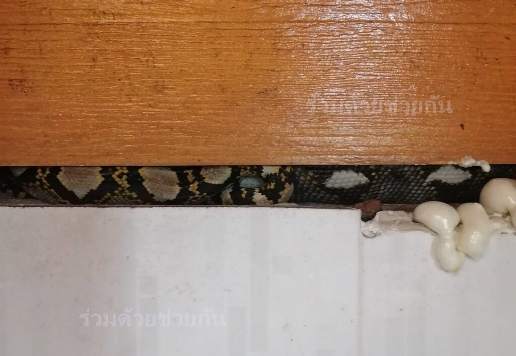 อาสาร่วมด้วยฯ ช่วยจับงูเหลือมหลบซ่อนบริเวณซอกผนังห้องครัว ซอยสามวา 10 เขตคลองสามวา กรุงเทพฯ