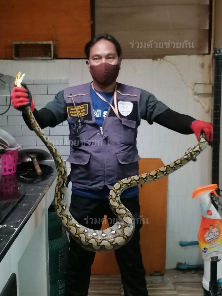 อาสานำอุปกรณ์เข้าช่วยเหลือสามารถจับงูไว้ได้ พบเป็นงูเหลือมความยาวประมาณ 3 เมตร หลบซ่อนบริเวณซอกผนังบ้านภายในห้องครัว พร้อมนำปล่อยคืนสู่ธรรมชาติห่างไกลบ้านเรือนประชาชน