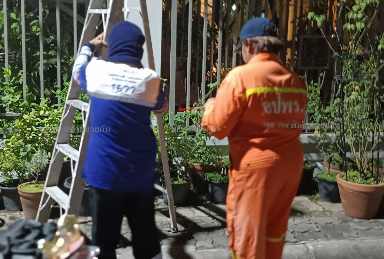ตรวจสอบพบผึ้งทำรังบนต้นไม้ข้างกำแพงรั้วบ้าน อาสาฯ จึงใช้บันไดปีนขึ้นไป นำอุปกรณ์จุดไฟเผาไล่รมควัน กำจัดผึ้งออกจากรังได้สำเร็จ และเคลื่อนย้ายออกจากพื้นที่เรียบร้อย