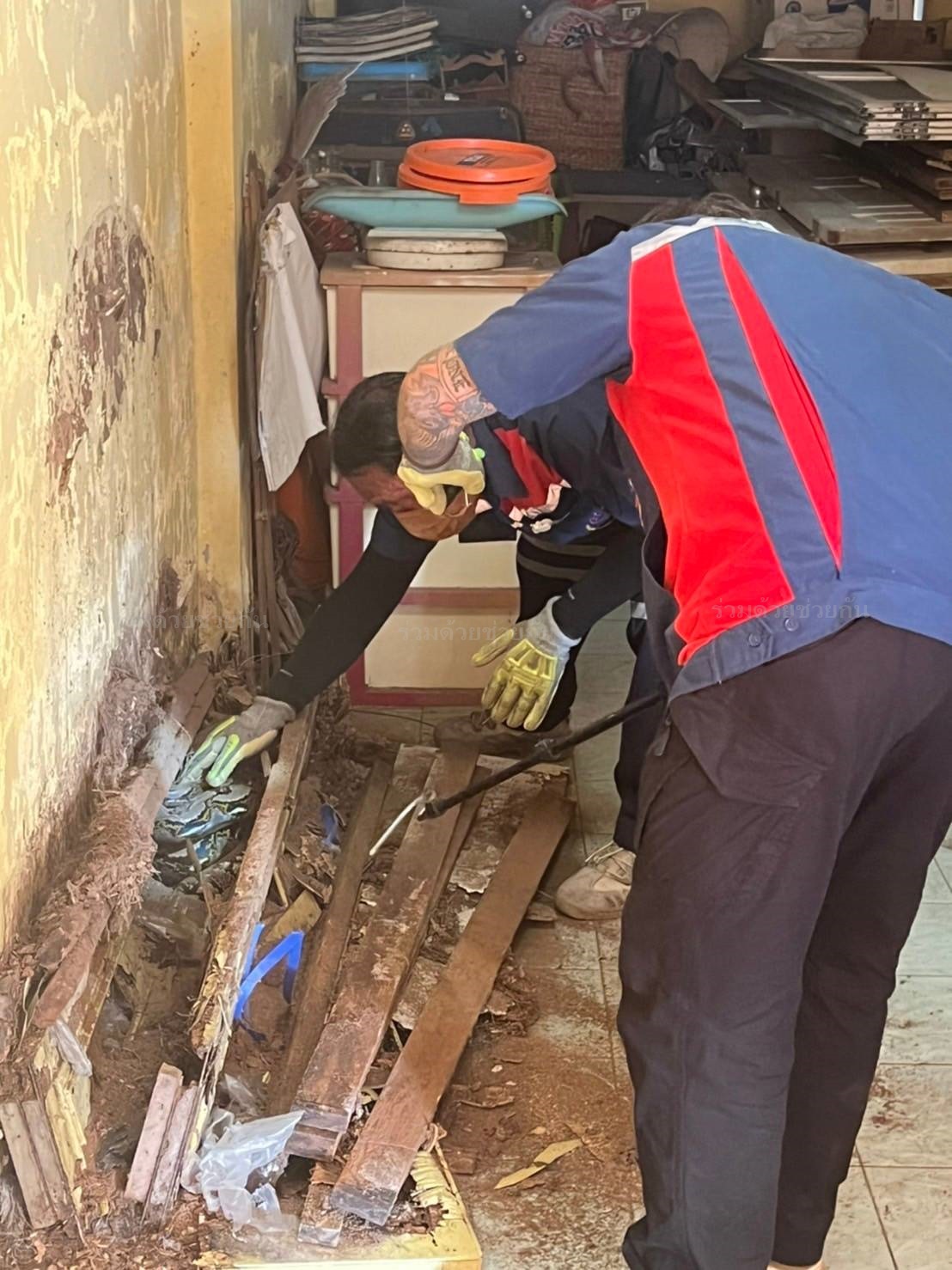 ตรวจสอบพบงูซุกตัวอยู่ซอกผนังกำแพง อาสาฯ ขุดโพรงใต้พื้นบ้านเข้าไป พบงูเหลือมความยาวประมาณ 3 เมตร ก่อนช่วยกันจับออกมาได้สำเร็จ เพื่่อนำไปปล่อยคืนสู่ธรรมชาติต่อ