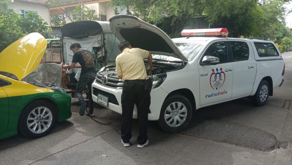 ทีมงานร่วมด้วยช่วยกัน รับแจ้งจากประชาชนขอความช่วยเหลือรถแบตเตอรี่หมด เป็นรถแท็กซี่ โตโยต้า สีเขียว/เหลือง จอดภายในชุมชนพลับพลา ซอย 3 ซอยรามคำแหง 21 ถนนประดิษฐ์มนูธรรม แขวงพลับพลา เขตวังทองหลาง กรุงเทพฯ