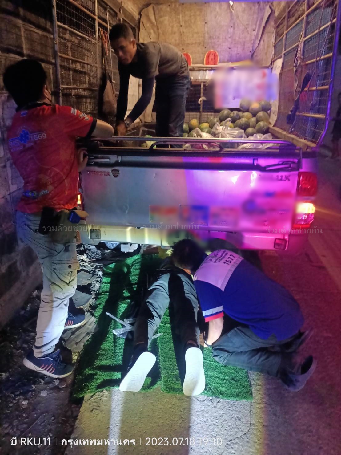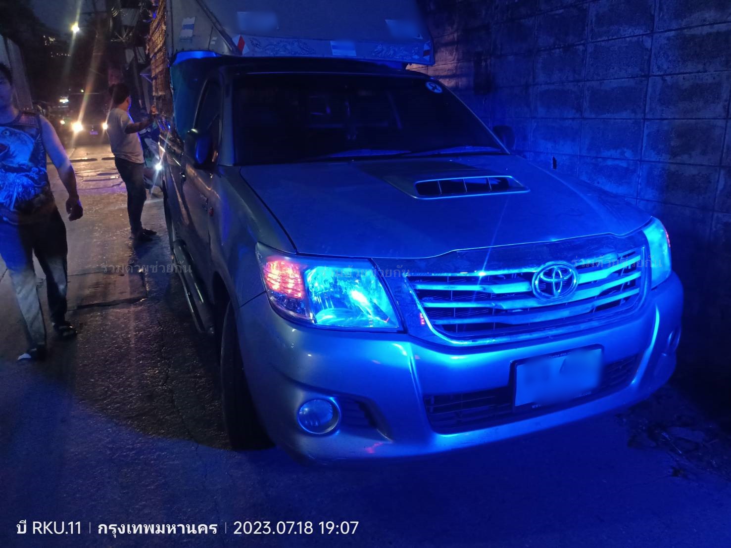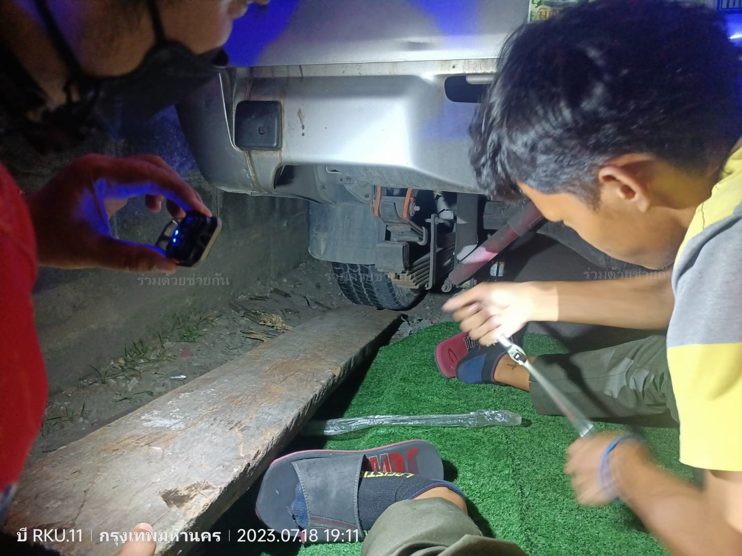 ที่เกิดเหตุพบรถกระบะ โตโยต้า สีบรอนซ์ เสียหลักตกข้างทาง ล้อรถติดหล่ม อาสาจึงนำไม้วางหนุนล้อรถเอาไว้ ก่อนนำอุปกรณ์ช่วยลากจูงรถขึ้นมาได้สำเร็จ สามารถเดินทางไปต่อได้ พื้นที่ สน.ทองหล่อ