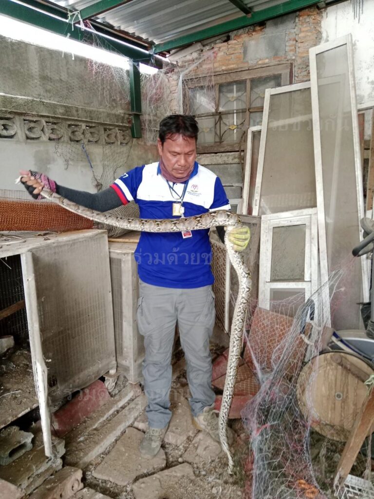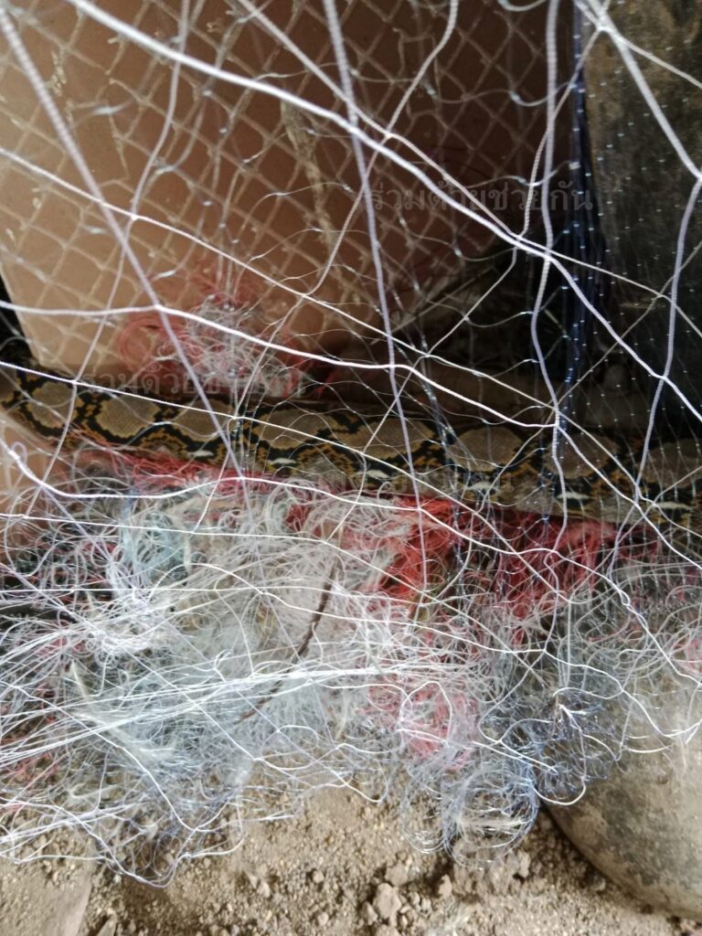 อาสาตรวจสอบพบงูเหลือมความยาวประมาณ 3 เมตร ติดตาข่ายอยู่ข้างกรงเลี้ยงไก่บริเวณบ้านพัก อาสาใช้กรรไกรตัดตาข่ายสามารถนำงูออกมาได้สำเร็จ พร้อมนำปล่อยคืนสู่ธรรมชาติห่างไกลบ้านเรือนประชาชน