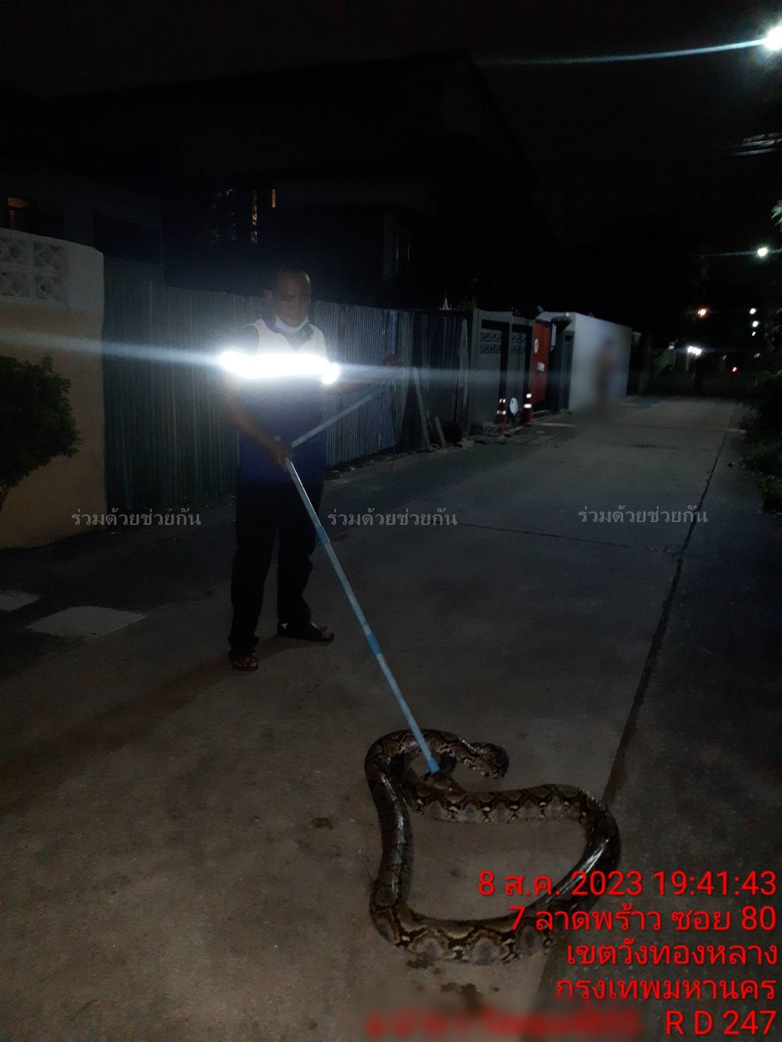 อาสาร่วมด้วยช่วยกัน รับแจ้งจากประชาชนขอความช่วยเหลือ มีงูเลื้อยเข้ามาภายในบ้าน ที่ซอยลาดพร้าว 80 แขวงวังทองหลาง เขตวังทองหลาง กรุงเทพฯ จึงเดินทางเข้าไปตรวจสอบพร้อมอุปกรณ์จับงู