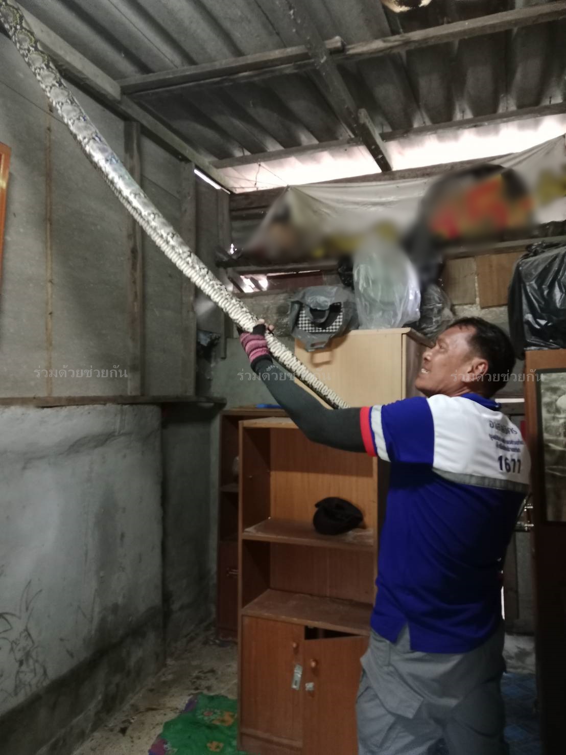 คุณพลอย ขอความช่วยเหลือ มีงูเหลือมเลื้อยเข้าบ้าน ซุกบนขื่อใต้หลังคา ที่ซอยพระยาสุเรนทร์ 16 แขวงบางชัน เขตคลองสามวา กรุงเทพฯ ศูนย์สื่อสารร่วมด้วยช่วยกัน ประสาน อาสาร่วมด้วยฐานคุ้มภัย เข้าไปช่วยจับ