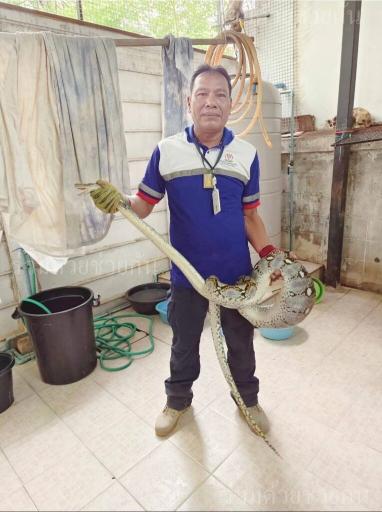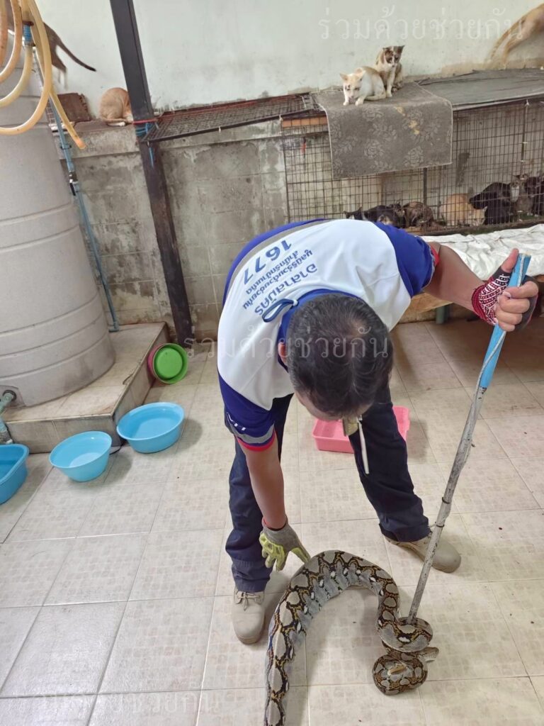 อาสาร่วมด้วยคุ้มภัย 006 ช่วยเหลือประชาชนจับงูเหลือมภายในบ้าน ถนนรามอินทรา แขวงรามอินทรา เขตคันนายาว กรุงเทพฯ ตรวจสอบ พบงูเหลือมกินแมวและเลื้อยบนหลังคาบ้าน อาสาร่วมด้วยฯ ดำเนินการใช้อุปกรณ์จับได้สำเร็จ พร้อมนำส่งสถานีดับเพลิงบางเขน เพื่อปล่อยธรรมชาติต่อไป