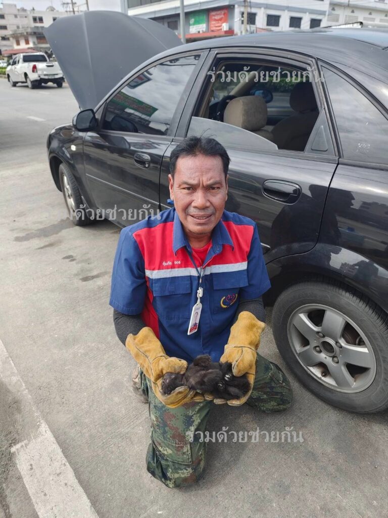 อาสาตรวจสอบพบลูกแมวสีดำติดใต้ท้องรถเก๋งเชฟโรเลต สีดำ อาสาดำเนินการช่วยเหลือสามารถนำลูกแมวออกมาได้ปลอดภัย และส่งมอบให้ผู้แจ้งเลี้ยงดูต่อไป