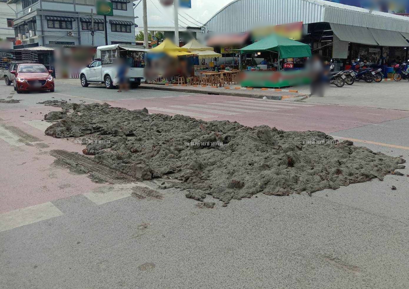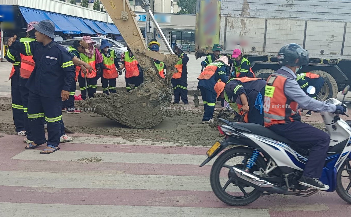 ดินโคลนตกหล่นบนถนน หวั่นอันตราย จนท.ต้องปิดถนนเร่งทำความสะอาด
