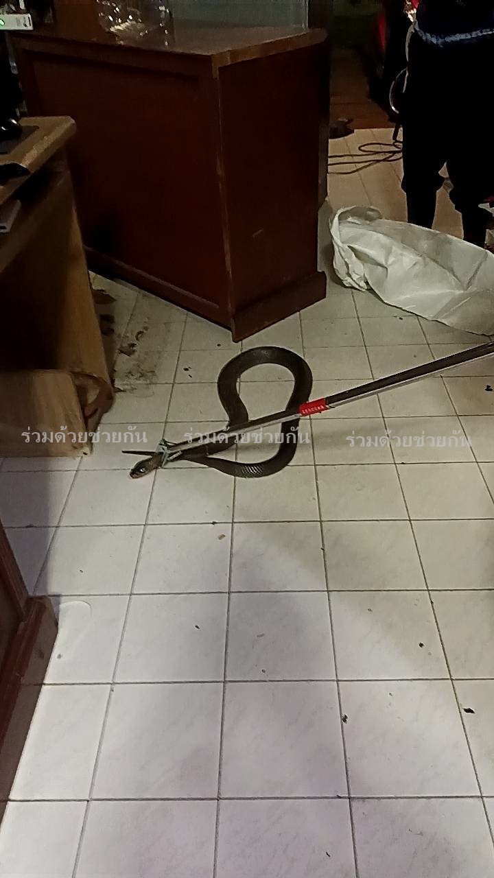 ตรวจสอบพบงูเห่าเข้าไปขดตัวอยู่บริเวณใต้โต๊ะ อาสาจึงนำอุปกรณ์คล้องจับไว้ได้ ก่อนนำไปปล่อยคืนสู่ธรรมชาติห่างไกลบ้านเรือนประชาชน ต่อไป พื้นที่ สน.โชคชัย