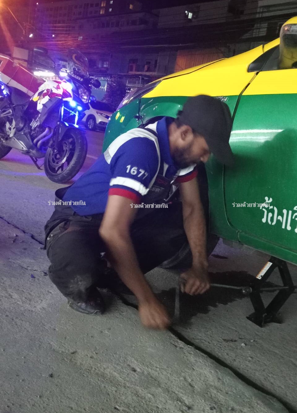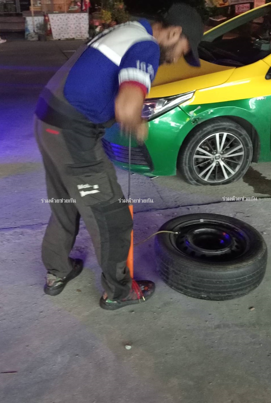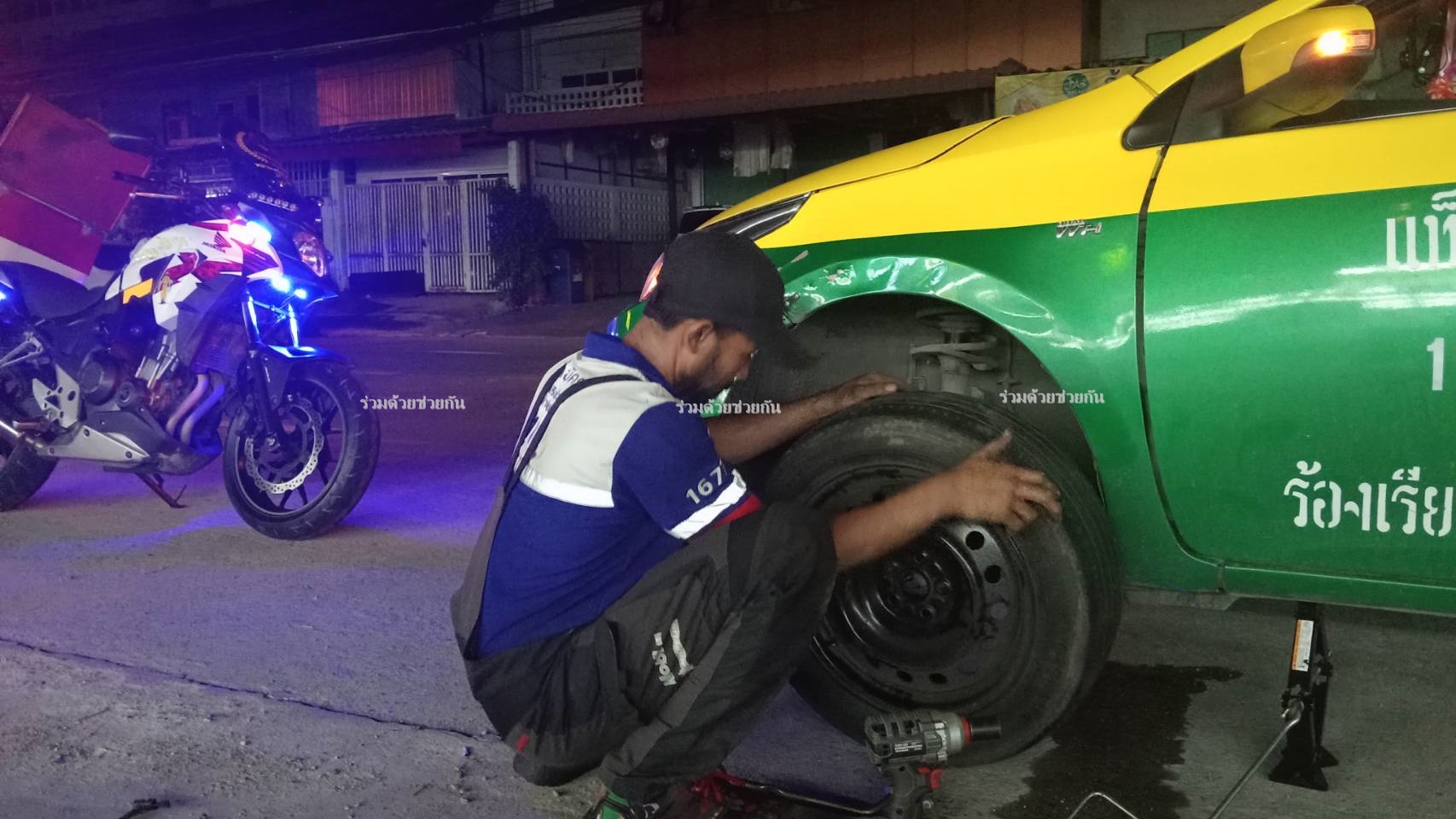 ตรวจสอบพบรถแท็กซี่โตโยต้า สีเขียว-เหลือง ล้อหน้าซ้ายยางแตก อาสาช่วยเปลี่ยนล้อยางให้สำเร็จ รถสามารถขับเคลื่อนต่อไปได้