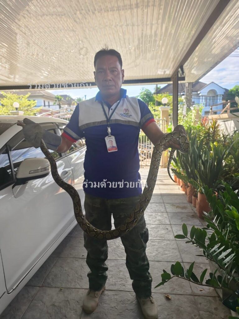 อาสาเข้าตรวจสอบพบงูเหลือมจำนวน 1 ตัวหลบอยู่ในซุ้มล้อรถยนต์ อาสาให้การช่วยเหลือสามารถนำงูออกมาได้สำเร็จ พร้อมนำปล่อยคืนสู่ธรรมชาติห่างไกลบ้านเรือนประชาชน