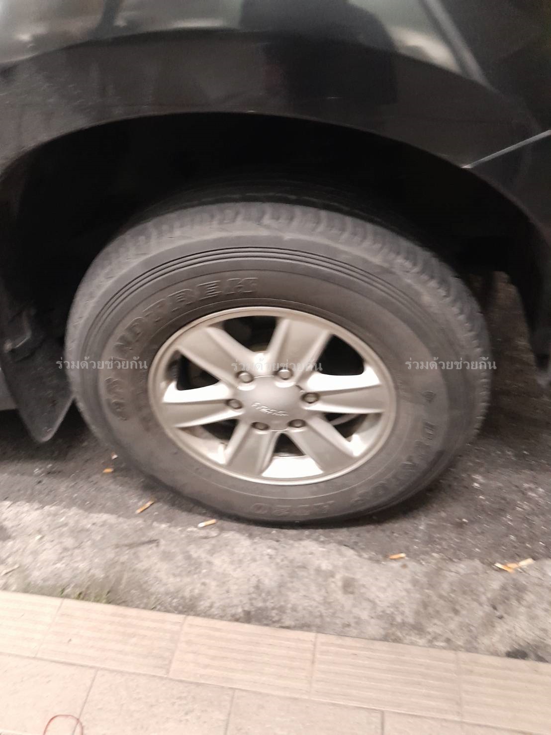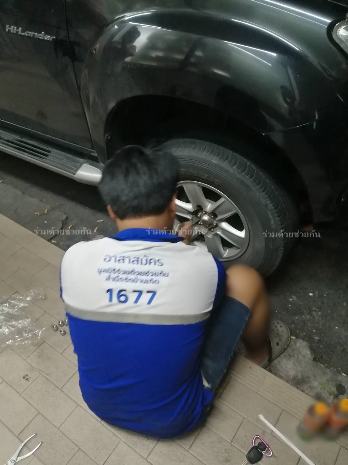 ตรวจสอบพบล้อหน้าขวายางแตก ขับต่อไปไม่ได้ อาสาจึงช่วยเปลี่ยนล้อยางให้ รถขับเคลื่อนต่อไปได้
