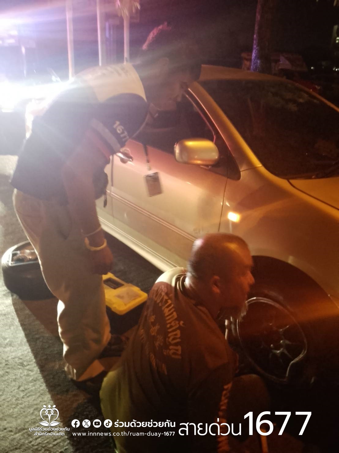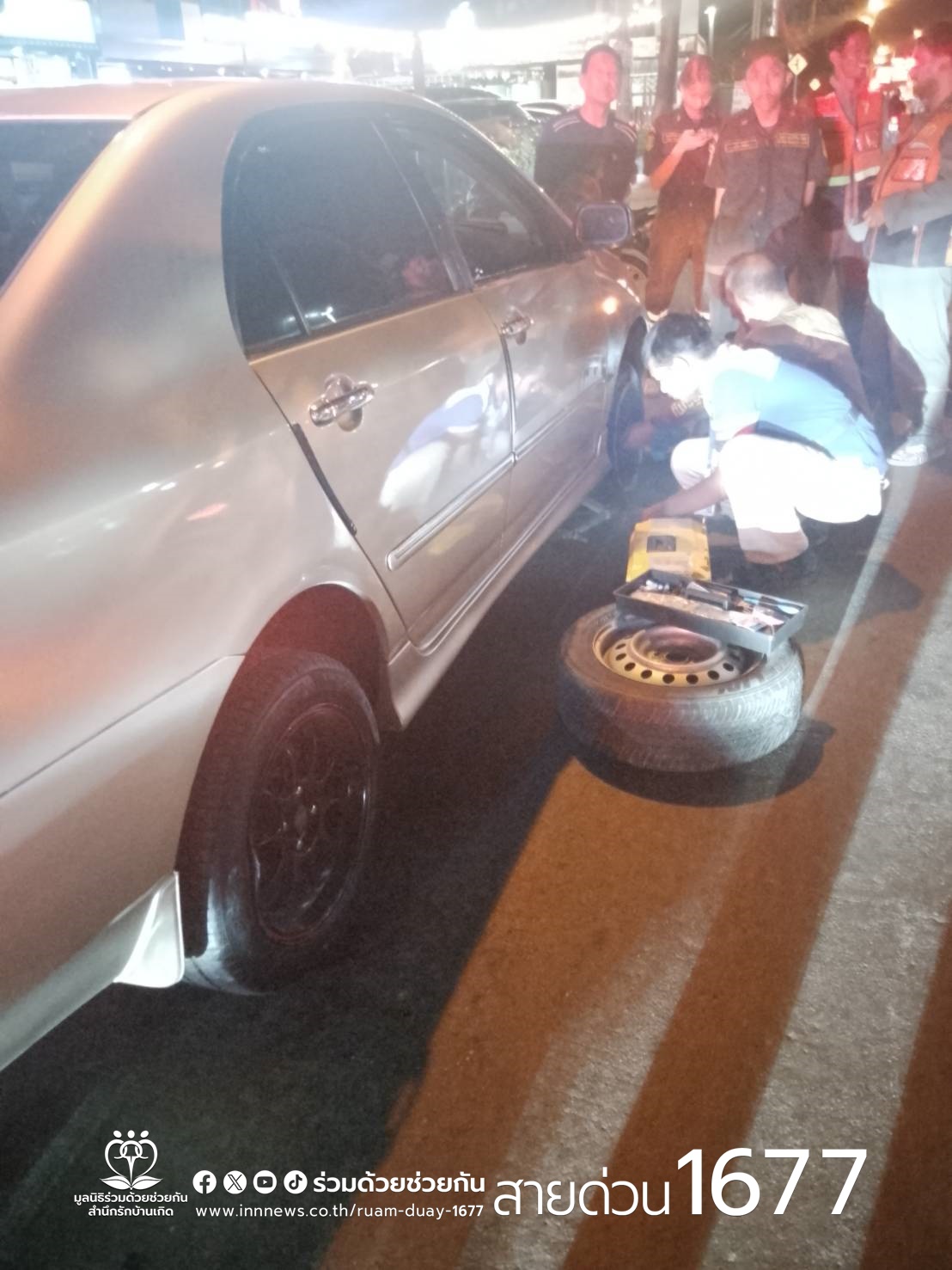 ตรวจสอบพบรถเก๋งโตโยต้า โคโรลล่า สีขาว ล้อหน้ายางแตก อาสาจึงช่วยเปลี่ยนล้อยางให้ สามารถขับเคลื่อนเดินทางต่อไปได้ตามปกติ พื้นที่ สน.ประเวศ