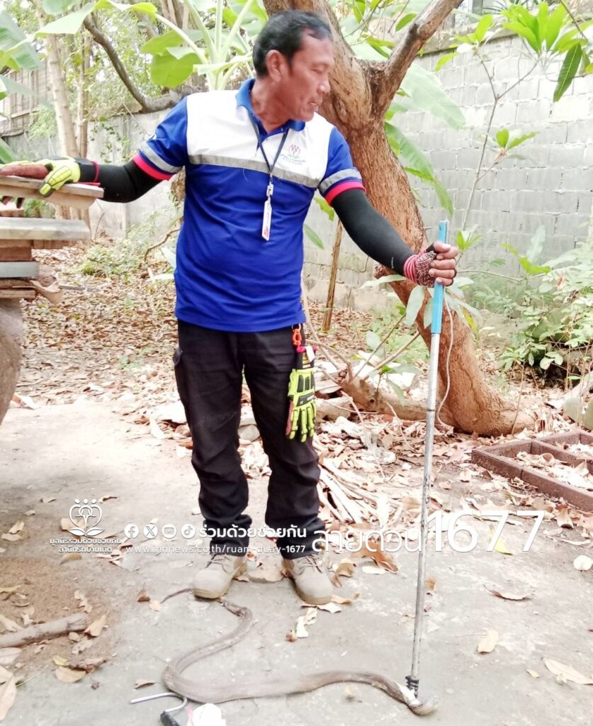 อาสาร่วมด้วยคุ้มภัย 006 ได้เข้าตรวจสอบพบเป็นงูเห่าจำนวน 1 ตัว ความยาว 1 เมตรครึ่ง หลบซ่อนตัวอยู่โพรงปูนใต้ต้นไม้ข้างบ้านพัก จึงได้นำอุปกรณ์เข้าช่วยเหลือ ทำการคล้องจับตัวงูดึงออกมาได้เป็นผลสำเร็จ และนำไปปล่อยคืนสู่ธรรมชาติห่างไกลบ้านเรือนประชาชนต่อไป พื้นที่สน.โคกคราม