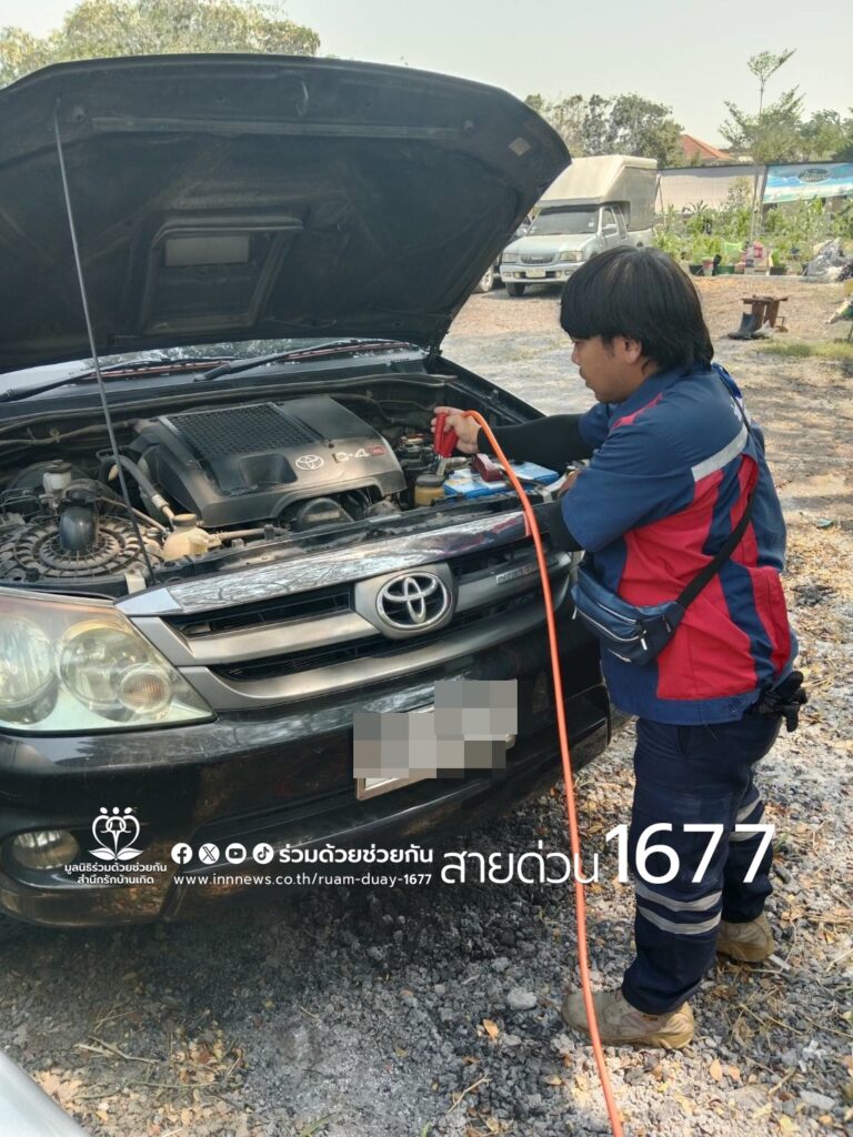 ศูนย์สื่อสารร่วมด้วยช่วยกัน ประสานอาสาร่วมด้วยคุ้มภัย 006 และ 032 นำอุปกรณ์เข้าช่วยเหลือพ่วงแบตเตอรี่ได้สำเร็จ รถสตาร์ทติดขับเคลื่อนต่อไปได้